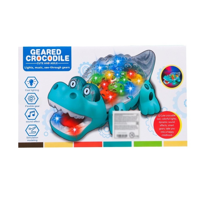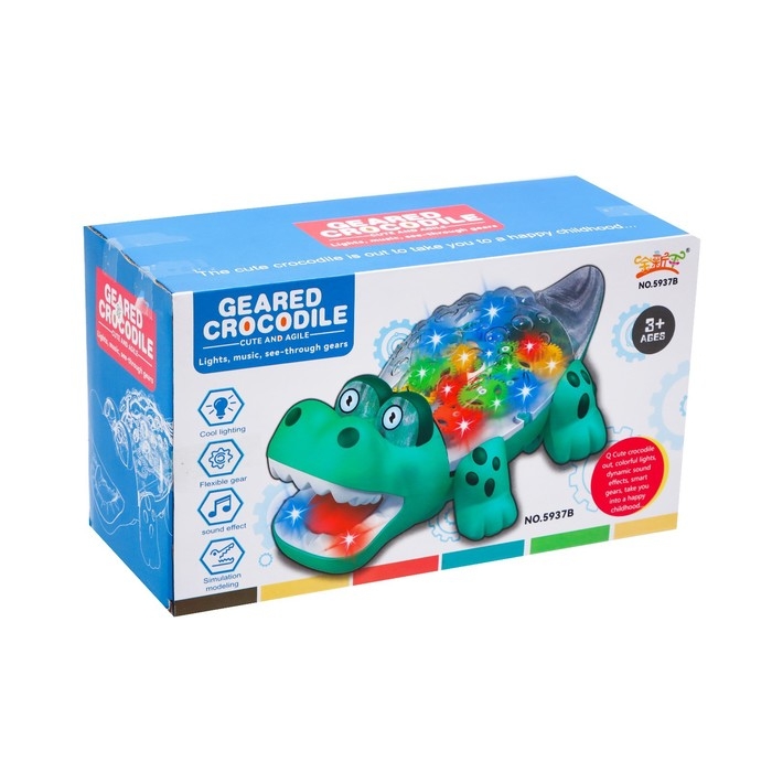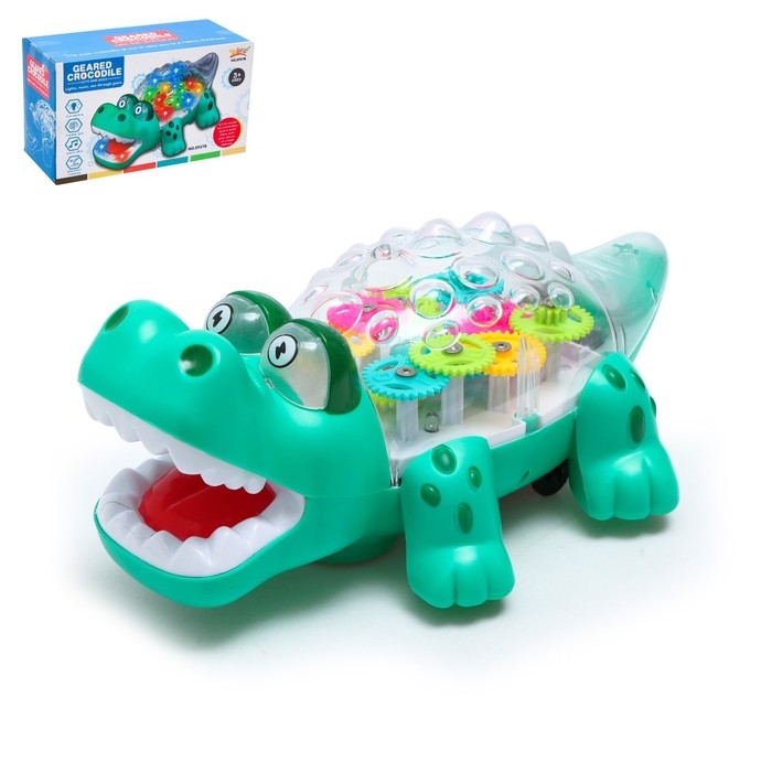 Крокодил «Шестерёнка» создан для маленьких любителей животных. Он самостоятельно катается по полу благодаря специальному моторчику на батарейках. Во время игры игрушка светится и внутри крутятся шестерёнки.