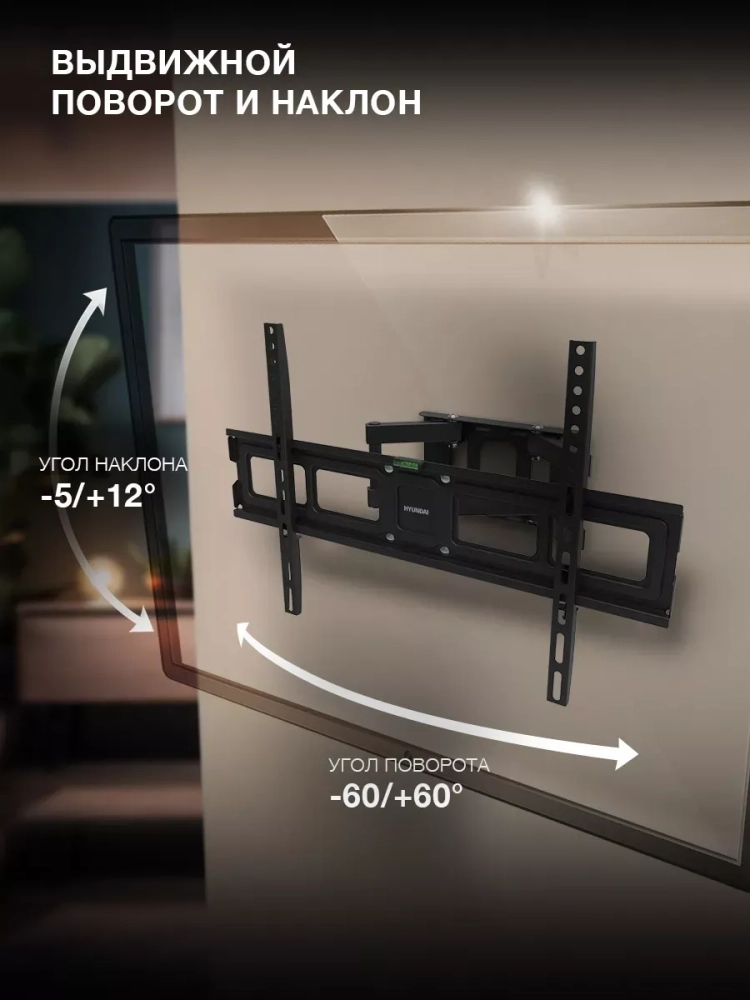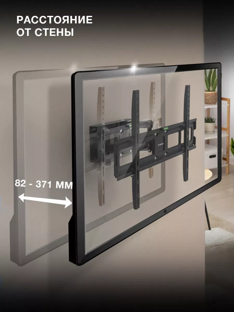 Ещё одно достоинство конструкции Hyundai GL-N5 – двухрычажный выносной механизм. Он позволяет изменять расстояние от стены до телевизора в диапазоне от 82 до 371 мм, а также поворачивать его на 60 градусов влево или вправо. В сочетании с возможностью наклона на 5 градусов вверх или на 12 градусов вниз это раскрывает широкие возможности для выбора места размещения монитора и регулирования положения экрана для наиболее комфортного обзора из любой точки комнаты.