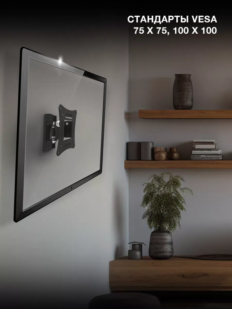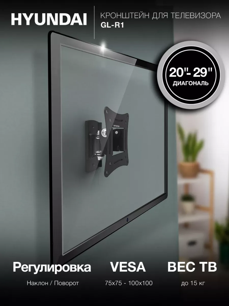 Компактный наклонно-поворотный кронштейн Hyundai GL-R1 – идеальный вариант для размещения на стене любого телевизора с диагональю экрана 20-29 дюймов весом до 15 кг, оснащенного креплениями стандарта VESA 75х75 и 100х100. Крепежная площадка самого кронштейна размером всего 106х55 мм позволит расположить его на небольшом участке стены.