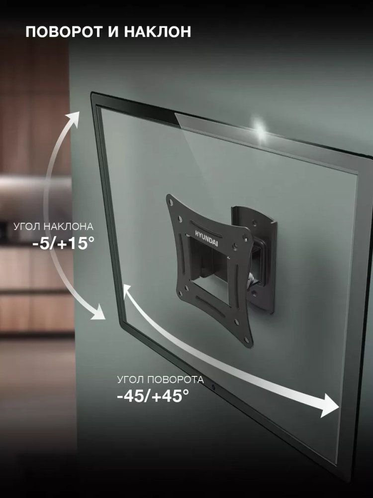 Кронштейн Hyundai GL-R1 позволит легко подобрать оптимальное положение экрана для просмотра, поворачивая висящий на стене телевизор до 45 градусов влево и вправо, на 5 градусов вверх и 15 градусов вниз.
