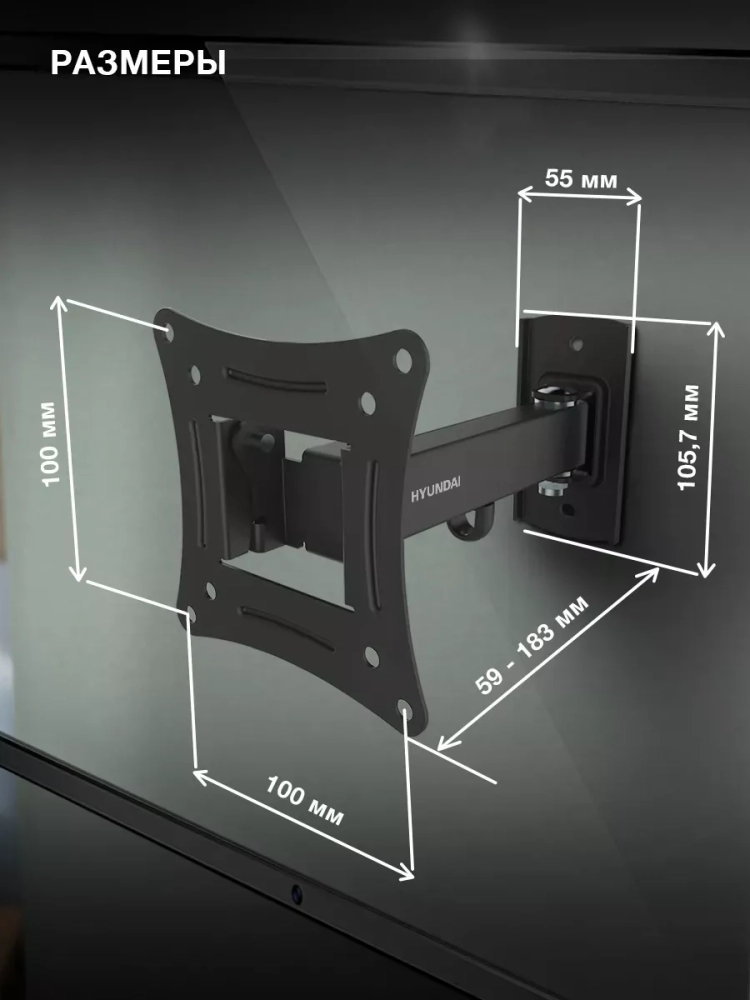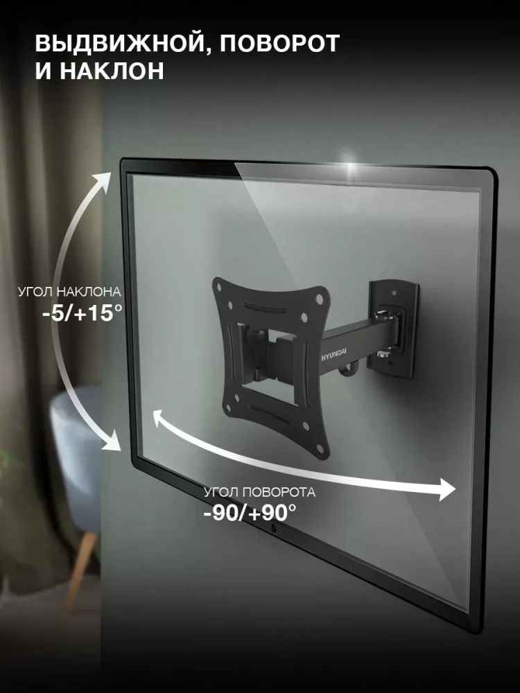 Отличительной особенностью кронштейна Hyundai GL-R3 является переменное расстояние от стены 59-183 мм. Это позволяет при необходимости повесить телевизор как на прямом участке, так и в углу комнаты.