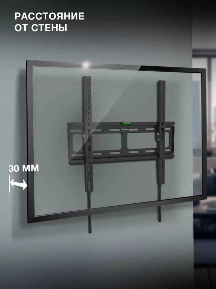 Стальной черный кронштейн для ТВ Hyundai GL-T2 позволяет поместить телевизор всего в 30 мм от стены, сэкономив максимум свободного пространства в помещении. В комплектацию входит всё необходимое для монтажа на кирпичных, бетонных и деревянных перегородках, включая трубчатый уровень для правильной ориентации относительно пола.