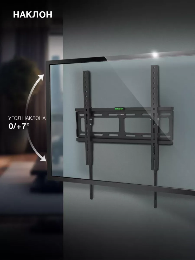 В кронштейне для ТВ Hyundai GL-T2 предусмотрена возможность наклона до 7 градусов вниз. Это обеспечивает возможность размещения телевизора на большем расстоянии от пола с сохранением комфортного угла обзора.