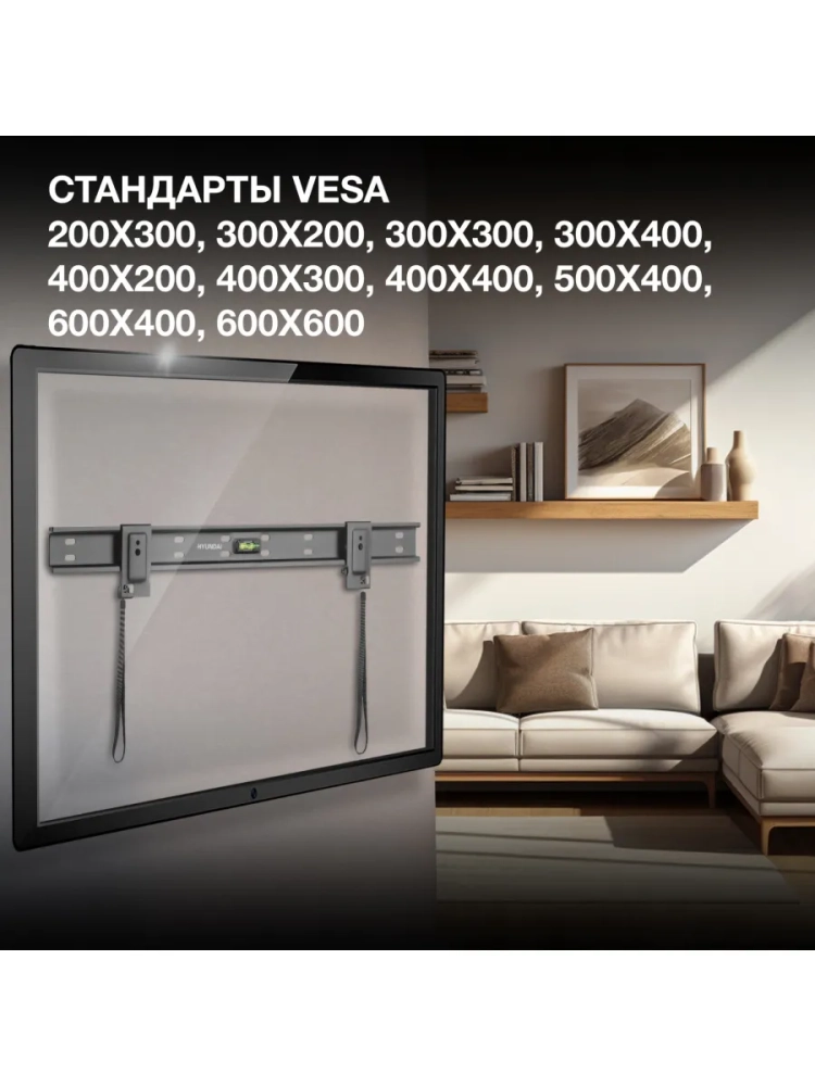 Кронштейн для телевизора Hyundai SL-X2 черный, рекомендуемая диагональ 37"-75", максимальная нагрузка 50кг, настенный, фиксированный, (HMS75XF050BK26) Поддержка крепления VESA: 200x200, 200x300, 300x200, 300x300, 300x400, 400x200, 400x300, 400x400, 500x400, 600x400