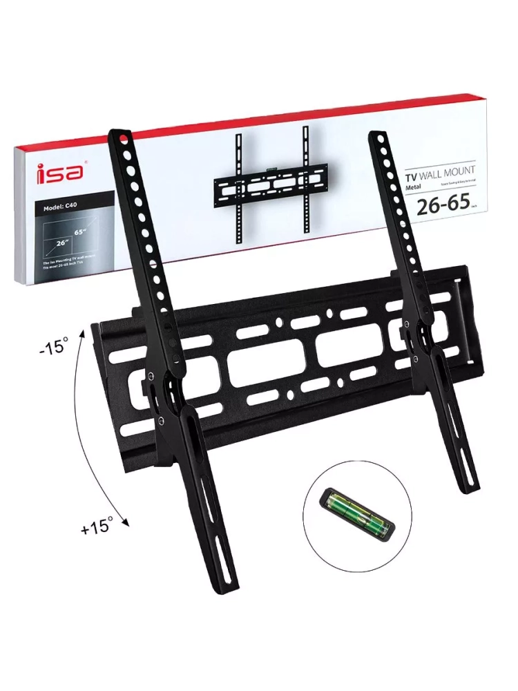 Наклонный кронштейн для телевизора или монитора C40 , для крепления к стене. Подойдет для устройств диагональю 26"-65". Изготовлен из прочного металла, подходит для установки в помещениях с любой планировкой. Имеет наклонный механизм. Не имеет поворотного механизма, предназначен для фиксирования телевизора. При выборе кронштейна необходимо знать какой стандарт VESA поддерживает телевизор (например, VESA 400 х 400). Цифры говорят о расстояниях в мм между крепежными отверстиями на телевизоре и креплении. Если значения у кронштейна и телевизора совпадают, то телевизор и крепление совместимы.Особенности:- Подходит для крепления LED телевизоров, LCD и плазменных телевизоров;- Простой и быстрый монтаж;- Выполнен из высокопрочной стали;- Незаметен за счет цвета и малых габаритов;- Наличие уровня для монтажа. Расстояние от стены: 52 мм. Угол наклона: влево и вправо 90 градусов. Максимальный вес: 30 КГ