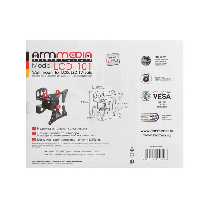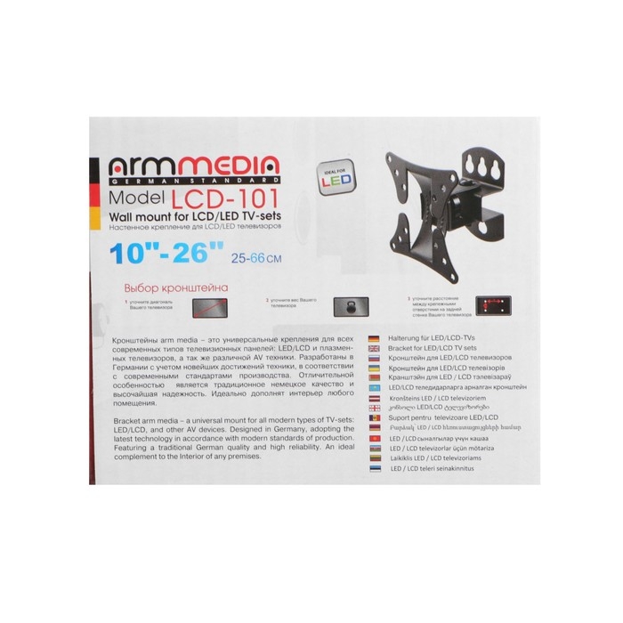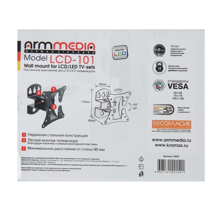 Кронштейн ARM Media используется для размещения ТВ с диагональю экрана 10-26 дюймов. Имеется поддержка стандартов VESA 50 х 50, 75 х 75, 100 х 100. Минимальное расстояние от стены до телевизора составляет 90 мм.