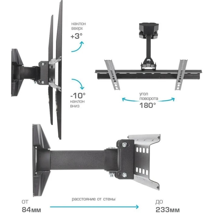 Кронштейн Luazon KrON-78, для ТВ, наклонно-поворотный, 14-52", 60-250 мм от стены, чёрный