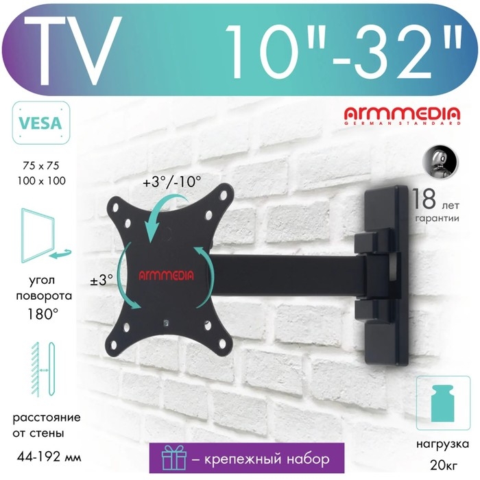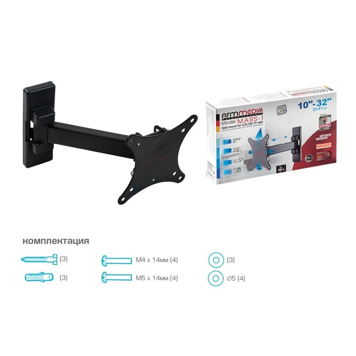 Кронштейн Arm media MARS-1, для ТВ, наклонно-поворотный, 10-32", до 20 кг, 44-192 мм, черный