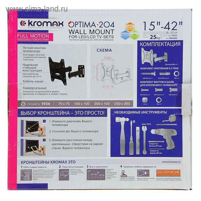 Кронштейн Kromax OPTIMA-204, для ТВ, наклонно-поворотный, 15-42", 68-323 мм от стены, черный