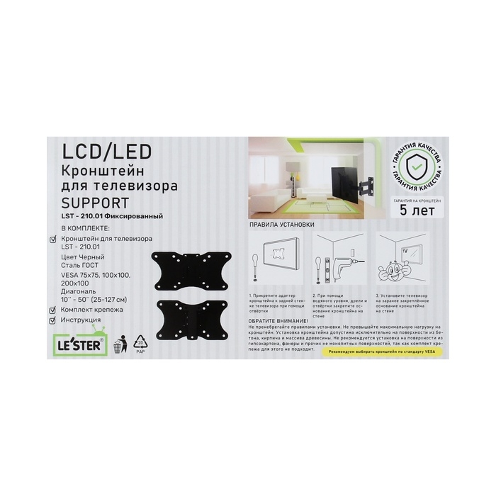 Кронштейн LE'STER LST-210.01, для ТВ, фиксированный, 10-50", 21 мм от стены, черный