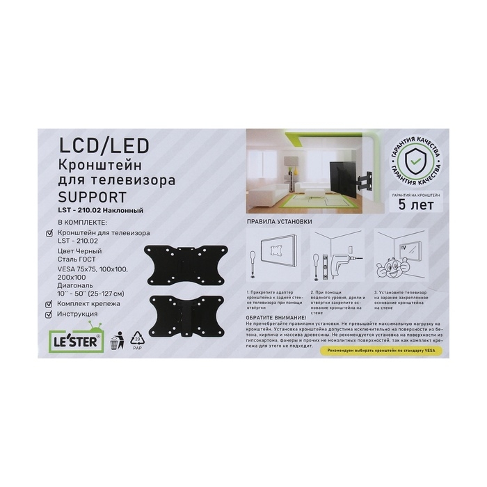Кронштейн LE'STER LST-210.02, для ТВ, наклонный, 10"-55", 50 мм от стены, черный