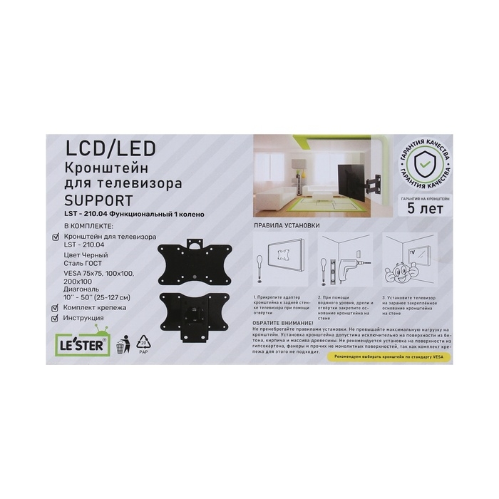 Кронштейн LE'STER LST-210.04, для ТВ, наклонно-поворотный,10-50",50-204 мм от стены,черный