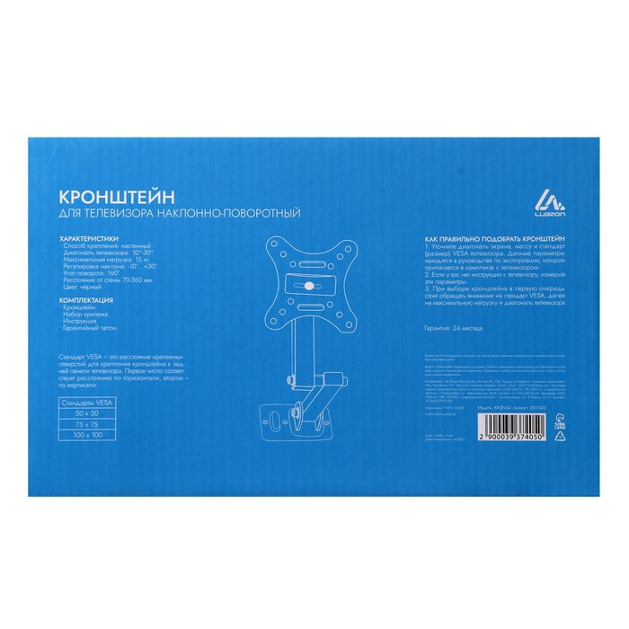 Кронштейн предназначен для крепления на стену большинства плоских телевизоров с диагональю от 10 до 32 дюймов. Выдерживает большую нагрузку, имеет прочный фиксирующий механизм, с помощью которого надёжно удерживает телевизор. Кроме того, в данной модели возможна регулировка наклона и поворота телевизора. Кронштейн позволяет закрепить телевизор в оптимальном положении как дома, так и в общественных местах.