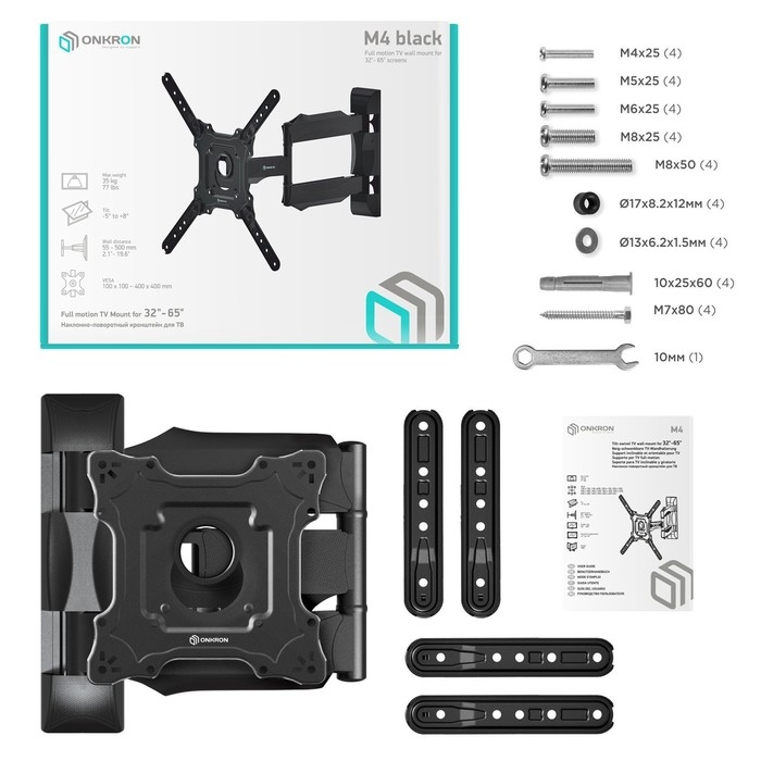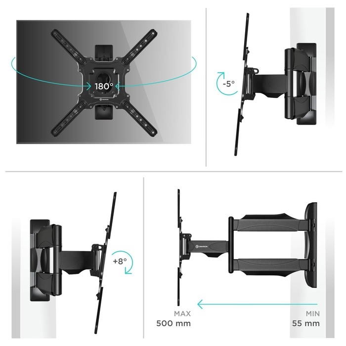 Кронштейн ONKRON M4, для ТВ, наклонно-поворотный, 32"-65", 55-500 мм от стены, черный
