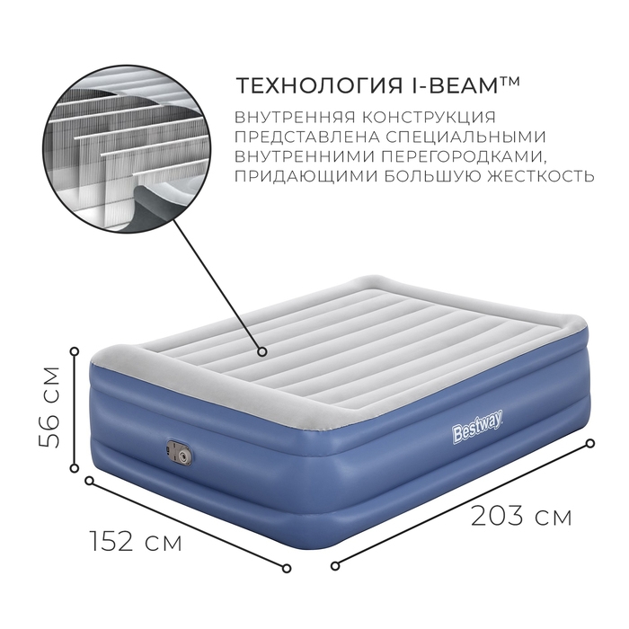 Кровать надувная Bestway Queen, 203×152×30 см, со встроенным электронасосом, 67836