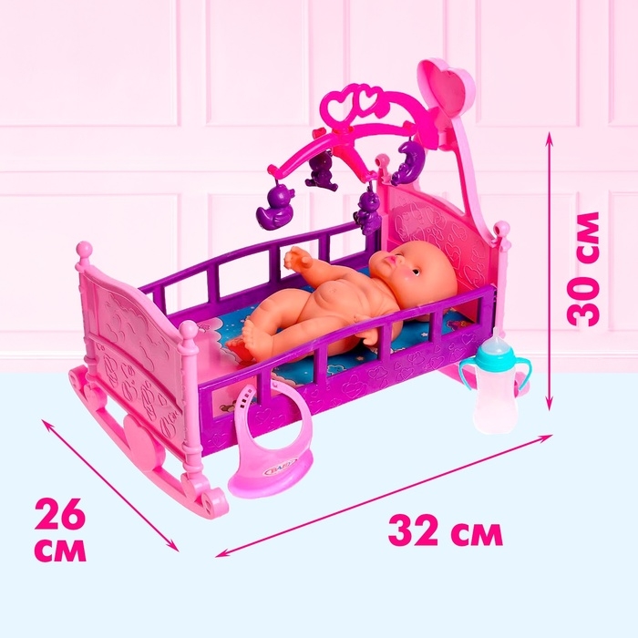 Ваша принцесса любит играть в дочки-матери? Тогда от этого набора с куклой, кроваткой и аксессуарами для пупсов она будет в восторге! Ведь малышка сможет покормить, положить пупса в кроватку, укачать его и наблюдать за тем, как игрушечный карапуз сладко спит.