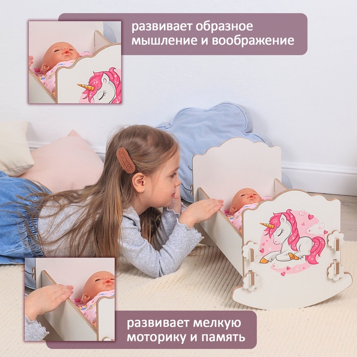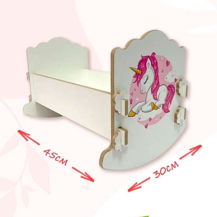 Кроватка-люлька «Единорог» — это настоящее украшение для ваших любимых кукол! Её размер в 43 см позволяет с лёгкостью разместить кукол среднего размера, что делает её универсальной для большинства игровых наборов. Выполненная из прочного дерева, эта люлька станет не только отличным подарком для вашего ребёнка, но и прекрасным украшением игровой комнаты.