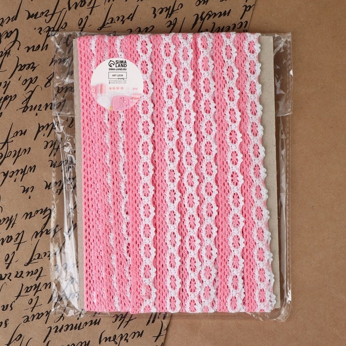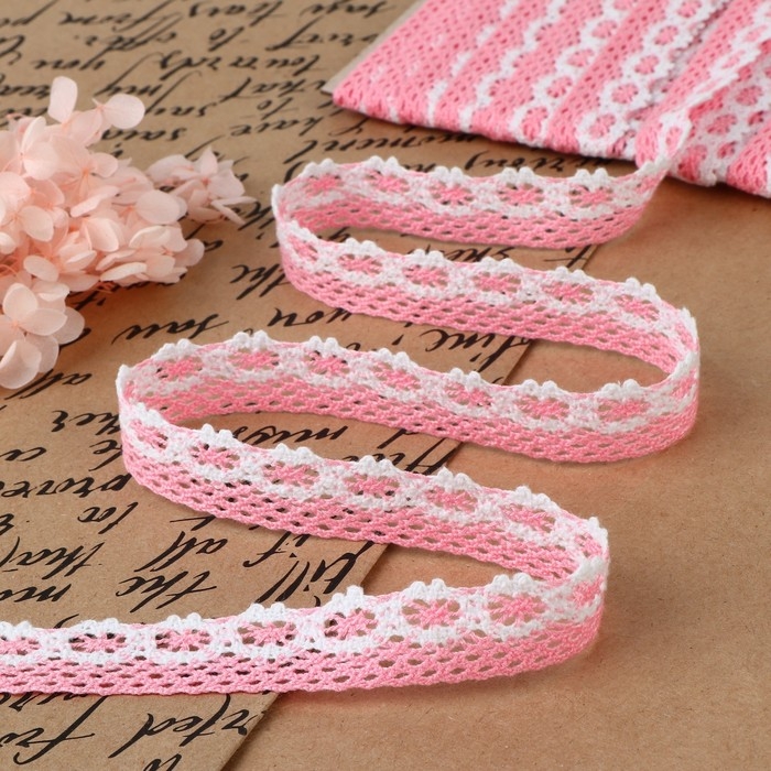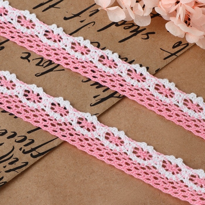 Кружево вязаное, 20 мм × 15 ± 1 м, цвет розовый/белый