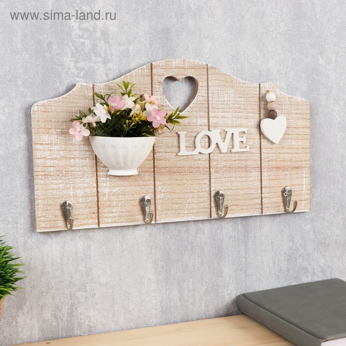 Крючки декоративные дерево "Вазон с цветами с сердечком" 19,5х35х3,5 см