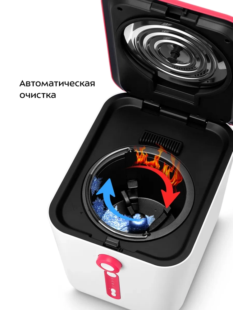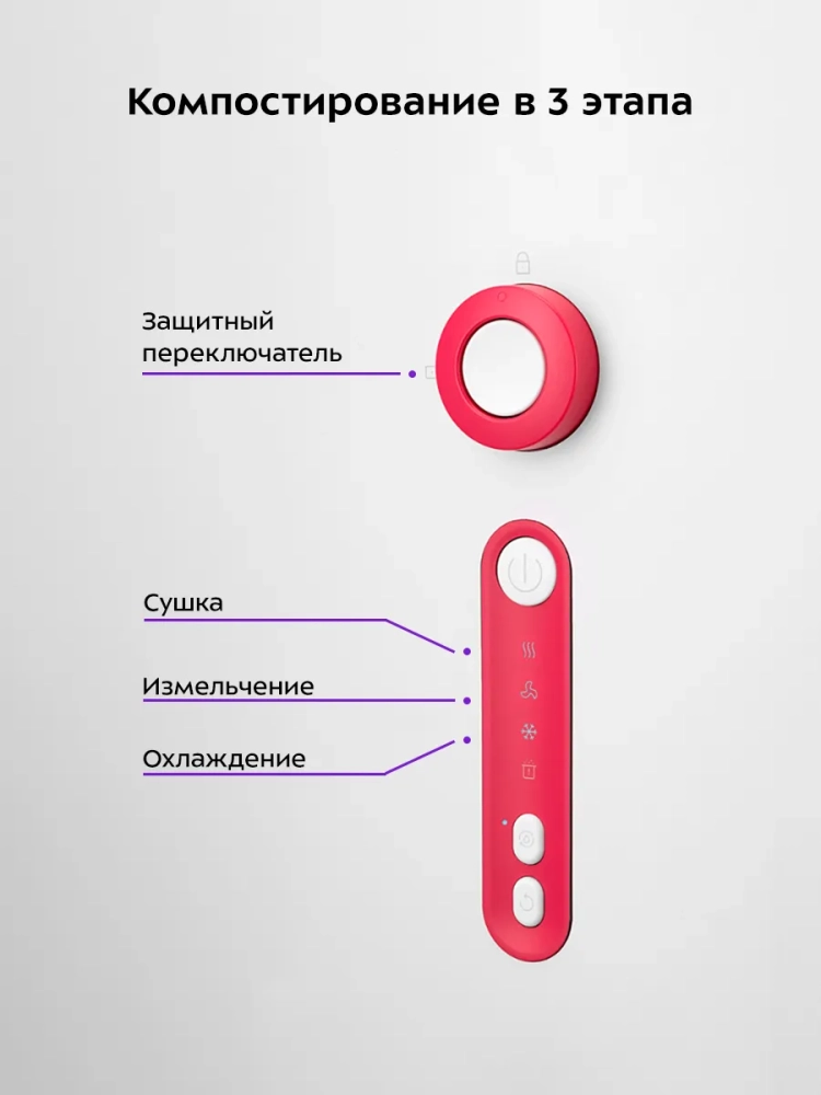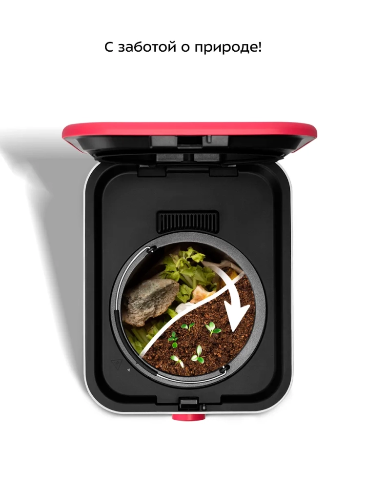 Процесс компостирования включает три стадии: сначала пищевые отходы сушатся под воздействием высокой температуры (95–105 °С), затем измельчаются и в конце охлаждаются. Фильтр с активированным углем поглощает неприятные запахи. Общее время компостирования составляет от 6 до 9,5 часов в зависимости от объема и типа пищевых отходов. Емкость ведерка составляет 3 литра, в результате компостирования объем пищевых отходов уменьшается более чем на 80%. В приборе также есть функция автоматической очистки ведерка.