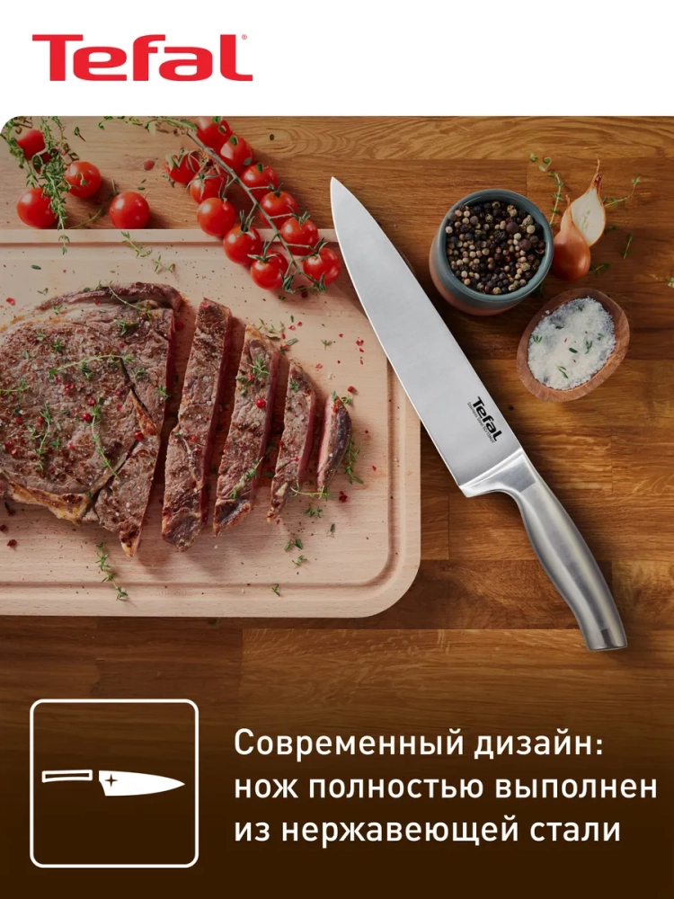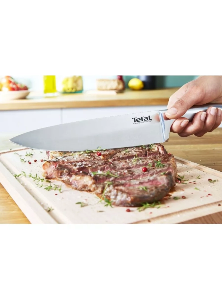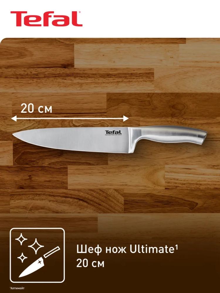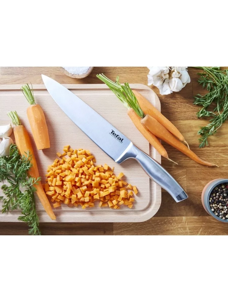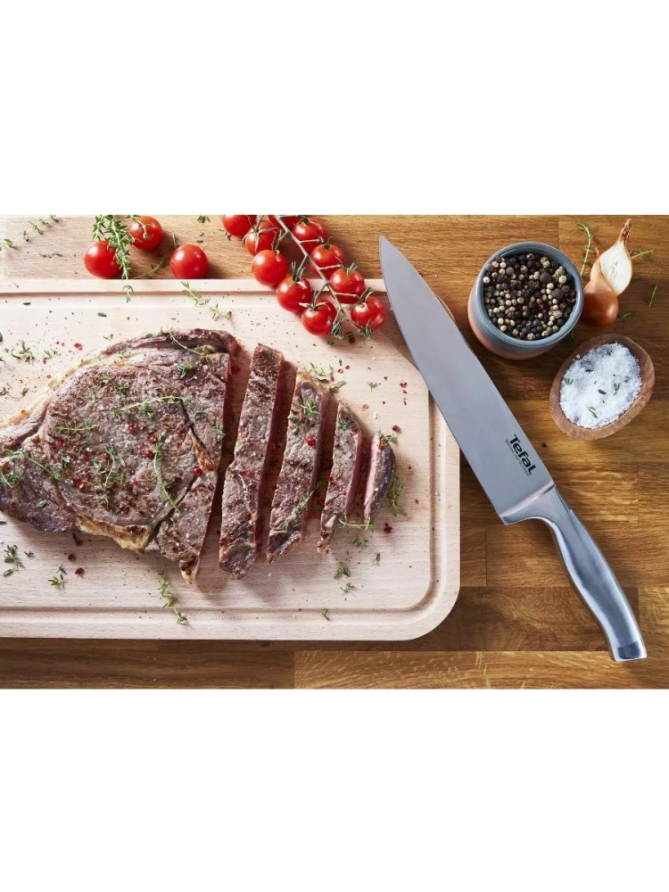 В коллекцию Ultimate входит 8 ножей для нарезки любых ингредиентов, как грубых, так и деликатных: поварской, сантоку, хлебный, нож для измельчения, нож для овощей, универсальный нож, нож для стейка и вилка для мяса. Поварской нож для кухни Ultimate от Tefal подарит вам удовольствие и максимальный комфорт при каждом использовании!