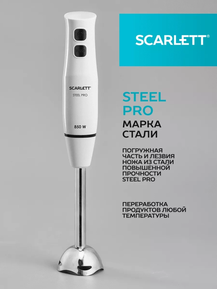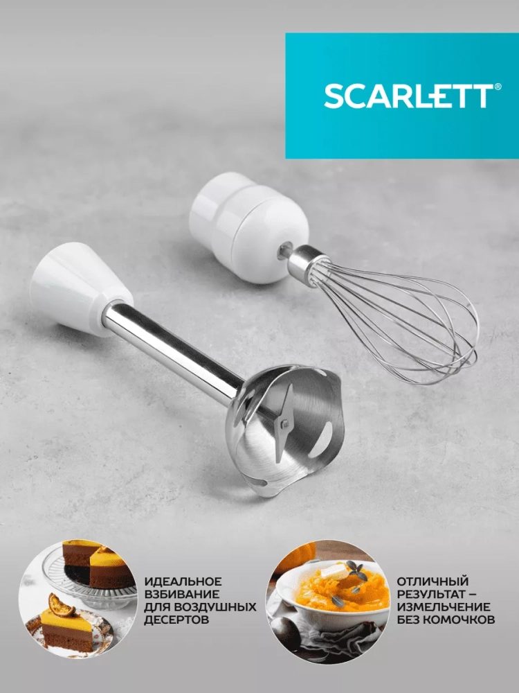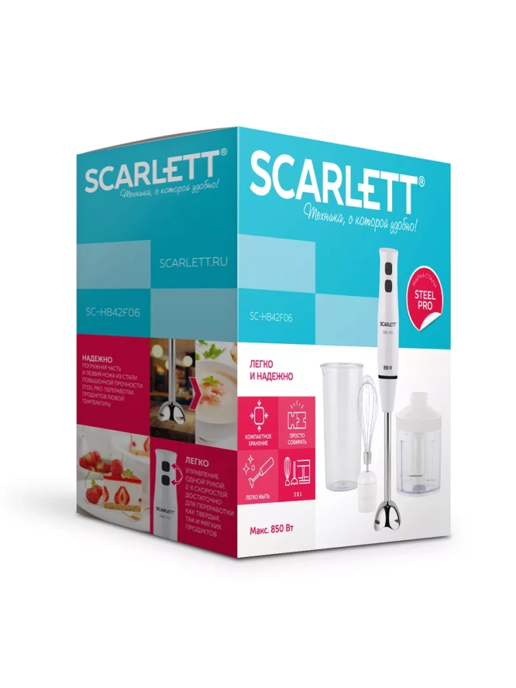 Scarlett SC-HB42F06 – погружной блендер, созданный, чтобы упростить и ускорить множество кулинарных задач. Так, модель быстро измельчит и перемешает до однородной консистенции ингредиенты крем-супов, пюре, соусов, взобьет воздушный крем из сливок и измельчает мясо и в фарш. Прибор оснащён двумя кнопками управления. Активируйте режим «Турбо», для измельчения наиболее твёрдых продуктов.