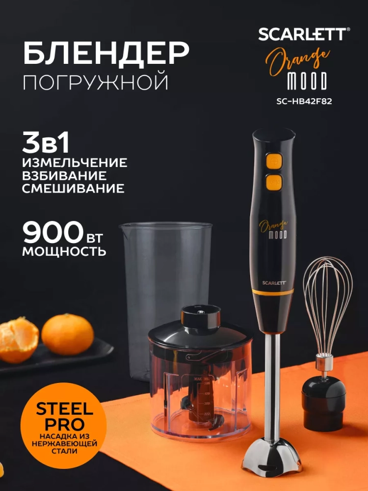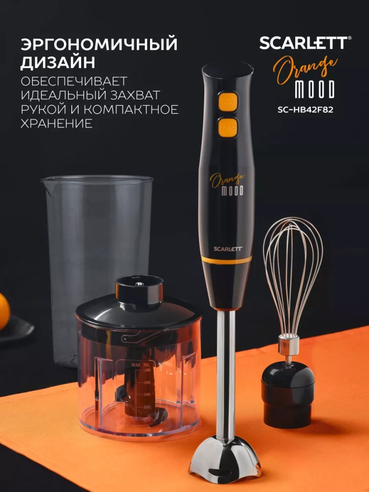 Блендер Scarlett SC-HB42F82 способен заменить сразу несколько кухонных приборов. Сливки, яичные белки взобьёт венчик, он же поможет в замешивании лёгкого теста, например, для блинчиков. Измельчитель (500 мл) быстро подготовит овощную поджарку для супа, мясо для запеканки или порубит орехи. Погружная насадка сделает пюре, такое однородное и нежное, что его можно будет использовать даже для детского питания. Также комплектация блендера дополнена мерным стаканом, который облегчит процесс приготовления.В особенно сложных случаях поможет режим «Турбо». Благодаря мощности 900 Вт самые трудоёмкие задачи будут решены за считанные секунды.Венчик, мини-измельчитель и погружную насадку можно мыть в посудомоечной машине