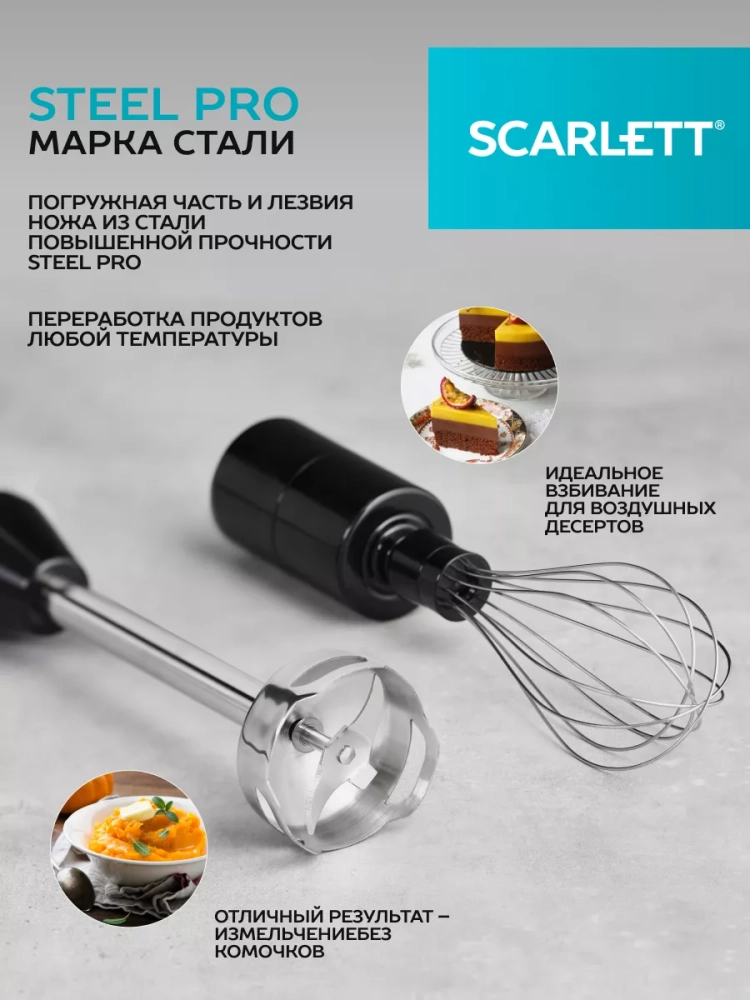 Блендер обладает удобной эргономичной ручкой, которая обеспечивает комфорт и легкость в процессе работы. Погружная часть и лезвия блендера изготовлены из прочной нержавеющей стали собственной марки STEEL PRO, что гарантирует долговечность прибора, а также его эффективность при обработке различных продуктов.