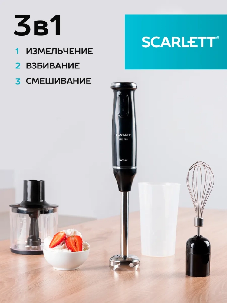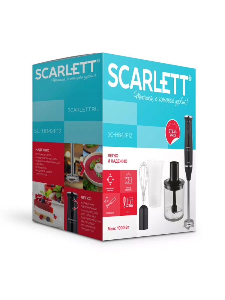 Scarlett SC-HB42F12 – блендер с мощным мотором 1000 Вт отлично справится с измельчением, взбиванием и смешиванием продуктов. Погружная часть и лезвия изготовлены из прочной нержавеющей стали собственной марки STEEL PRO, что гарантирует долговечность прибора. Прибор оснащён двумя кнопками управления. Активируйте второй режим для измельчения наиболее твёрдых продуктов. В комплекте к блендеру прилагаются насадка для измельчения и смешивания, мини-измельчитель, объём которого составляет 500 мл, металлический венчик для взбивания и мерный стакан, объемом 700 мл.