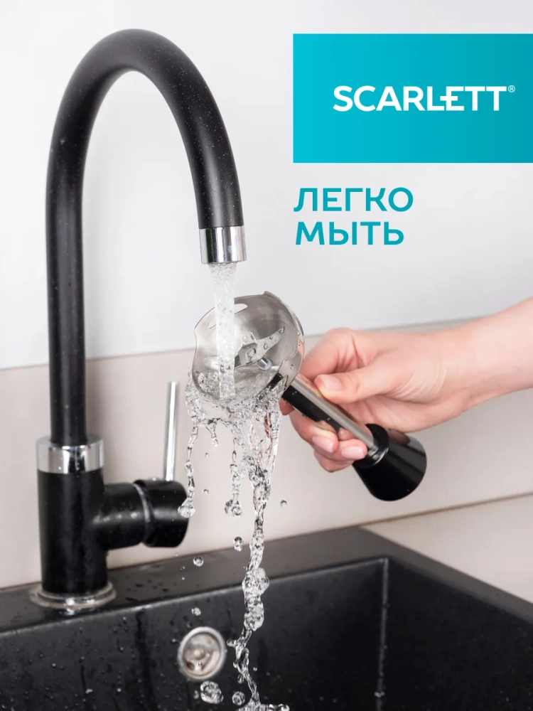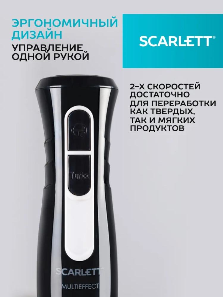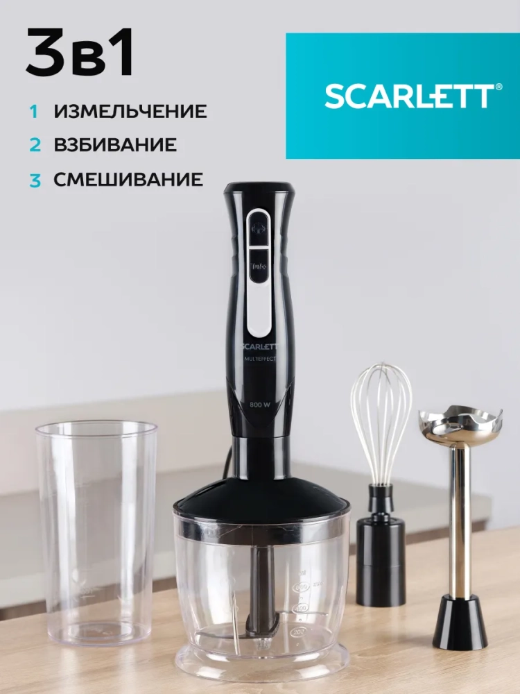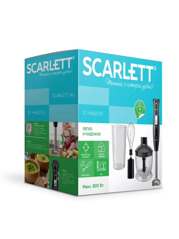 Погружной блендер Scarlett SC-HB42F35 мощностью 800 Вт может заменить сразу несколько кухонных приборов.