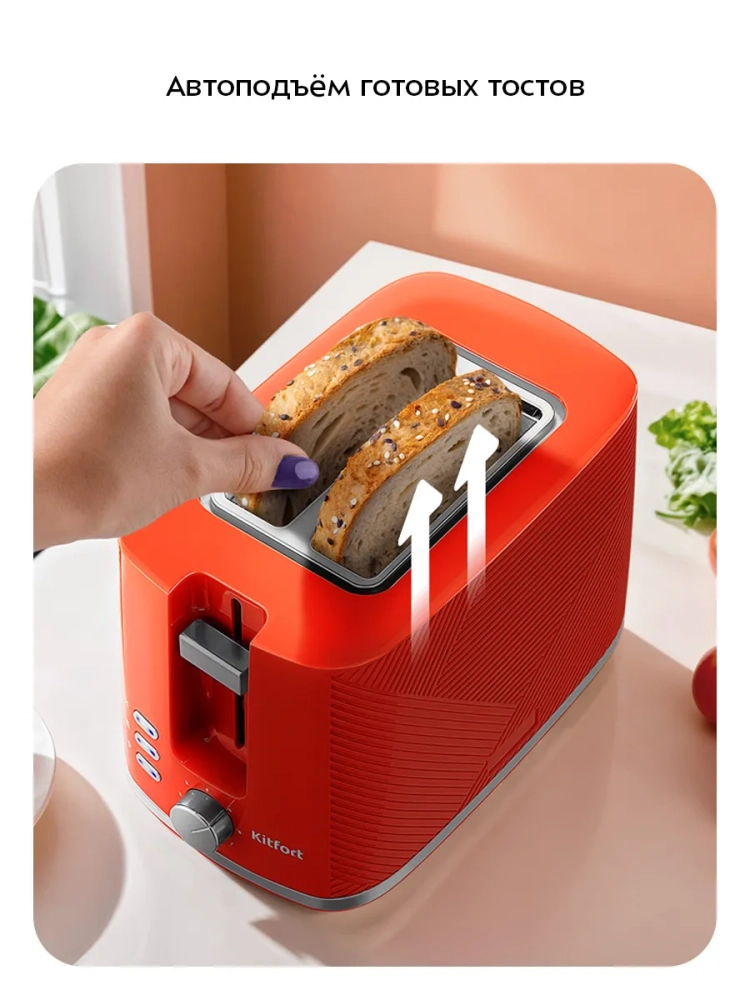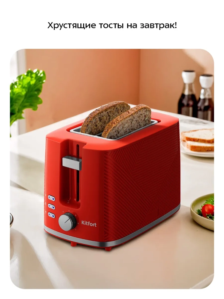 Кухонный тостер с поддоном для крошек KT-9867 от Kitfort — это современное решение для тех, кто ценит вкус и аромат свежеприготовленного хлеба. Этот электрический прибор оснащен инфракрасным нагревом, что позволяет тостам приобретать уникальный цвет и текстуру благодаря карамелизации сахара в муке. С 7 степенями обжаривания вы сможете выбрать идеальную степень поджарки для каждого кусочка хлеба. Тостер Китфорт предлагает несколько режимов работы: функция «Подогрев» идеально подходит для разогрева уже готовых тостов, а режим «Разморозка» позволяет приготовить их из замороженного хлеба. Автоматическая центровка обеспечивает равномерное обжаривание с обеих сторон независимо от толщины ломтика, что делает процесс приготовления простым и удобным. По завершении процесса приготовления устройство автоматически отключается и поднимает тосты вверх, облегчая их извлечение. Съемный поддон для крошек значительно упрощает очистку устройства от остатков хлебных крошек, поддерживая его в чистоте без лишних усилий. Этот электрический тостер рассчитан на приготовление одного или двух тостов одновременно и подходит как для домашнего использования в квартирах или загородных домах, так и в гостиничных номерах или офисах. Компактные размеры бытового устройства (267 x 160 x 175 мм) позволяют легко разместить его на кухне без ущерба свободному пространству.