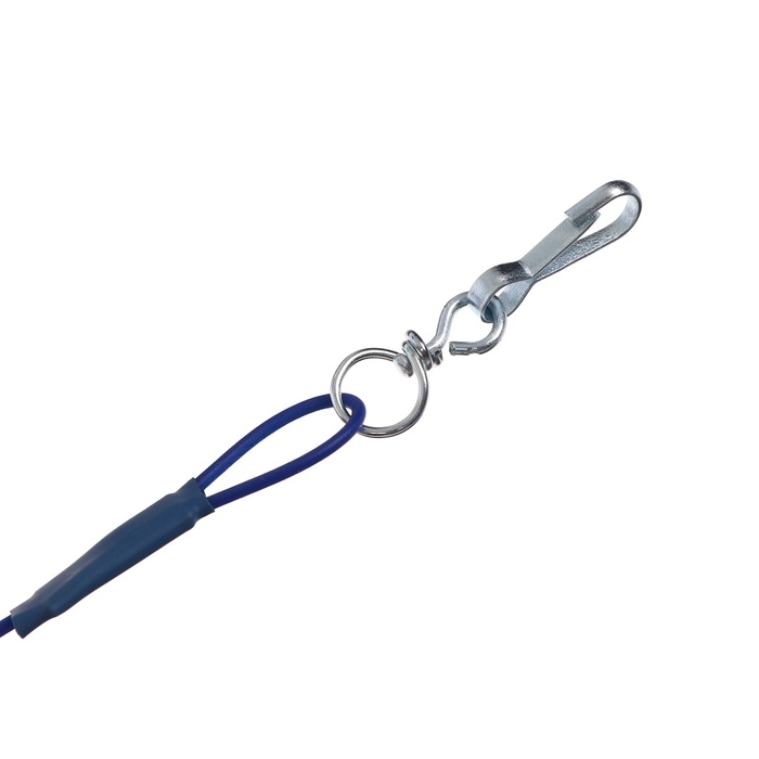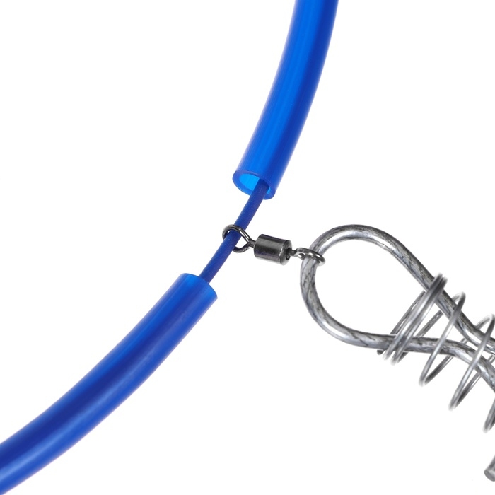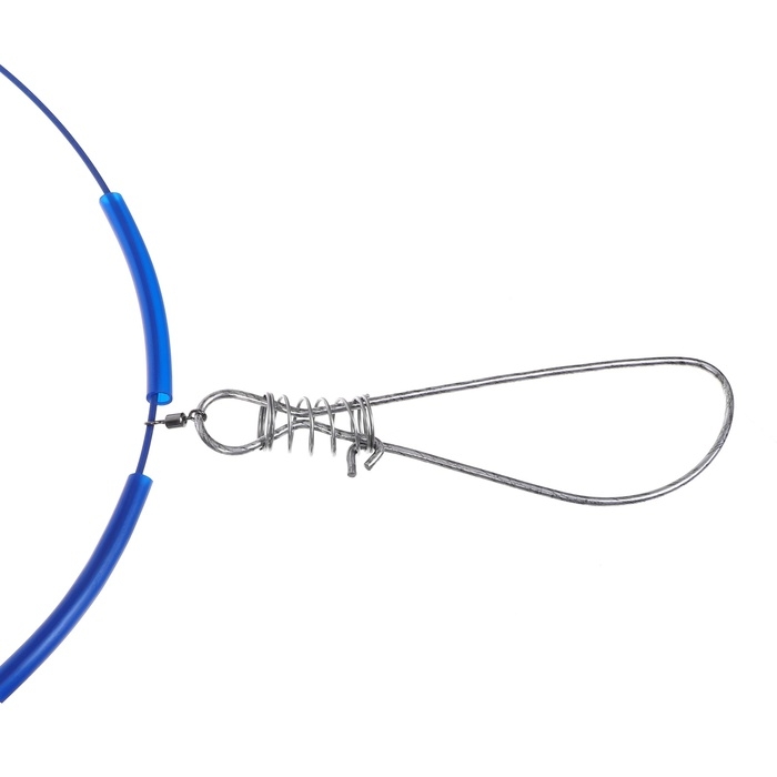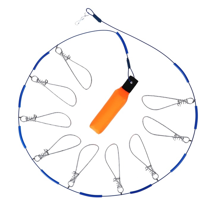 Средство для хранения рыбы в естественной среды в течении рыбалки. Кукан металлический сделан из троса с петлей на конце, в которую продет карабин. Крепление петли заизолированно. Трос имеет анти-коррозионное покрытие. Девять карабинов расположены через равное расстояние и не сбиваются, не съезжаются друг с другом.