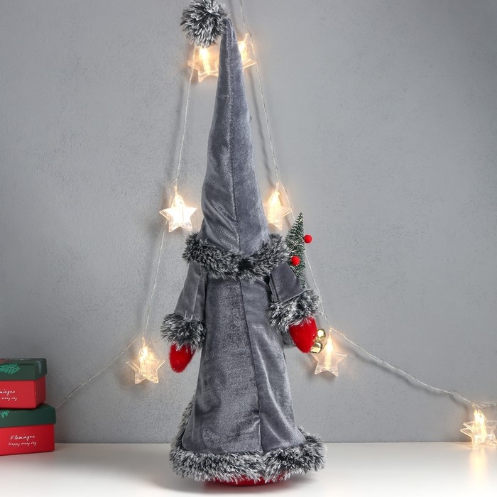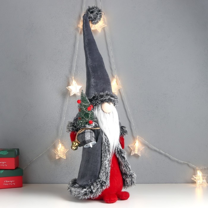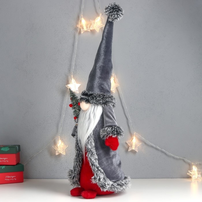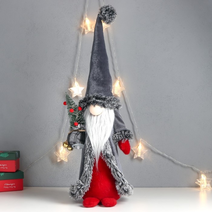 Кукла интерьерная "Дед Мороз с ёлкой в мешке, серая бархатная шуба" 51х18х18 см