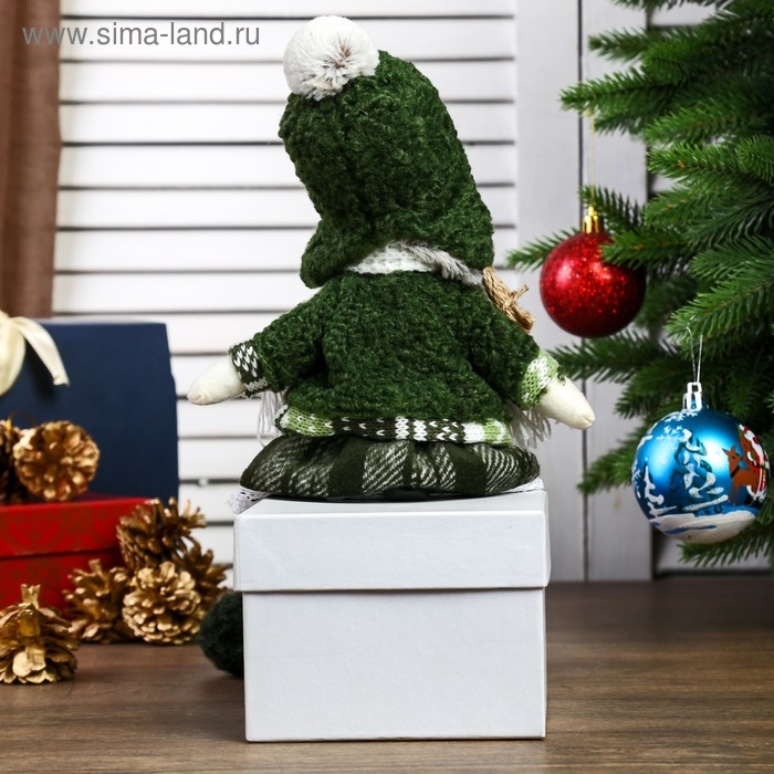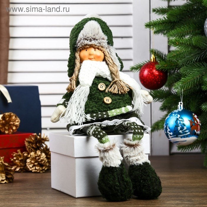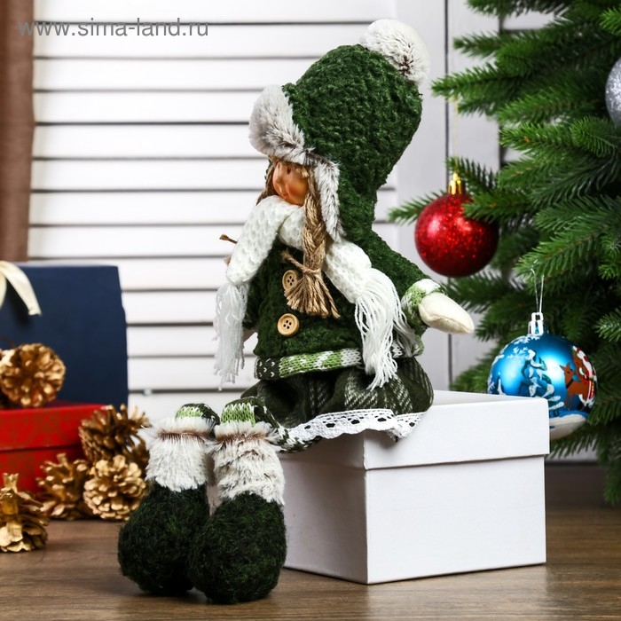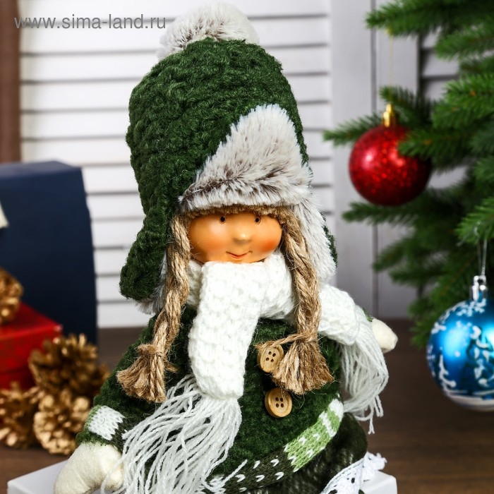 Кукла интерьерная "Девочка с косичками в зелёном пальто и зелёной шапочке" 36х8х13 см
