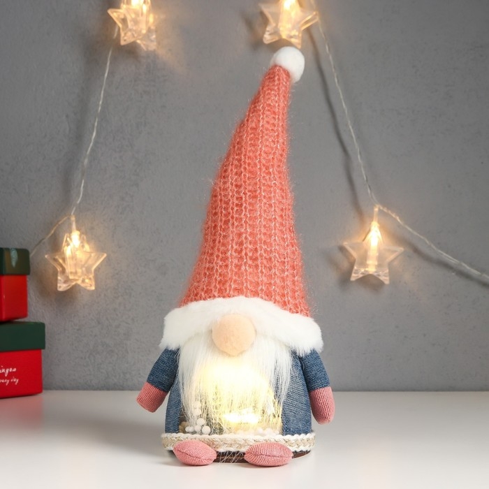 Кукла интерьерная свет "Дед Мороз в розовом вязаном колпаке" 32х12х11 см