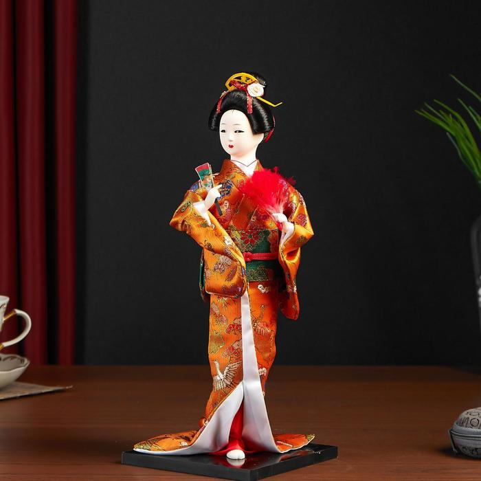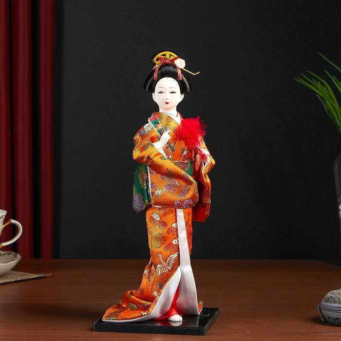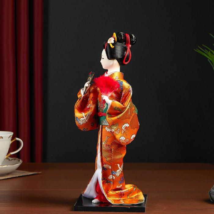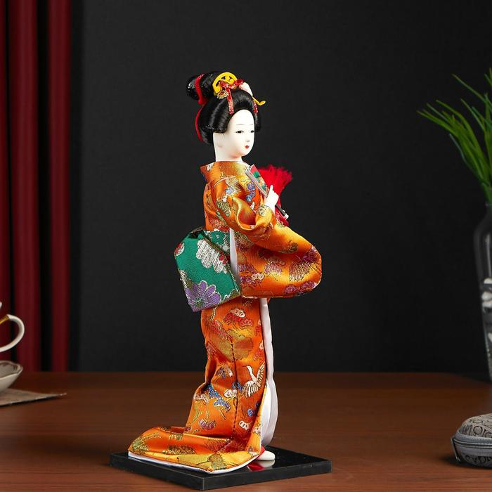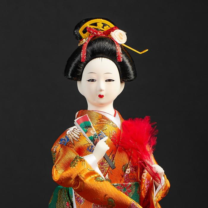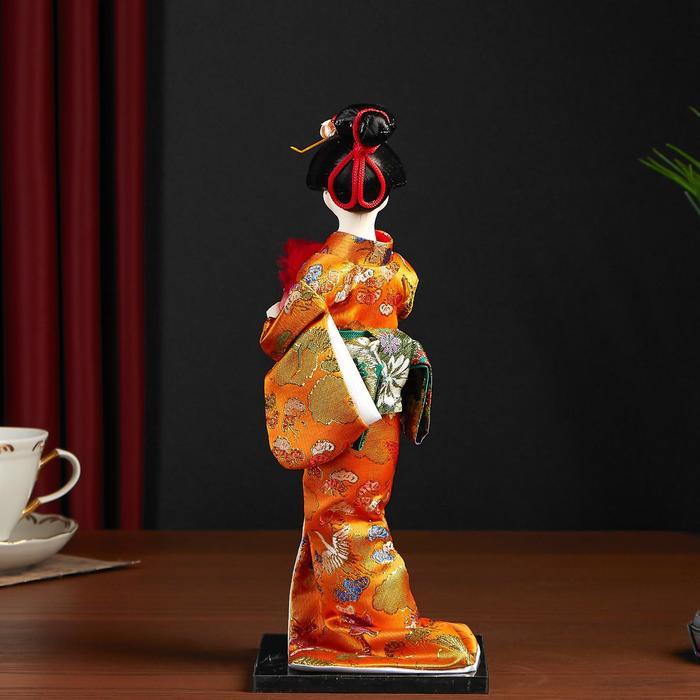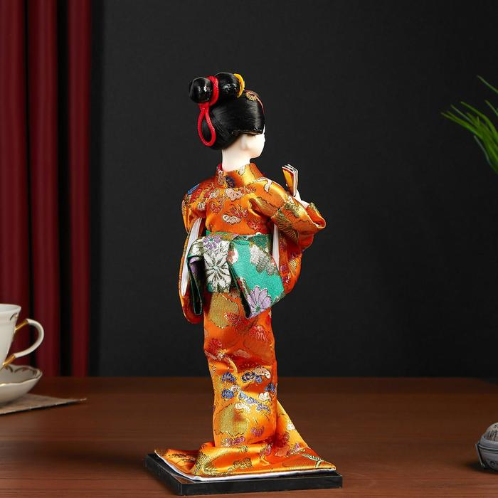 Кукла коллекционная "Гейша в оранжевом кимоно с веером" 22,5 см