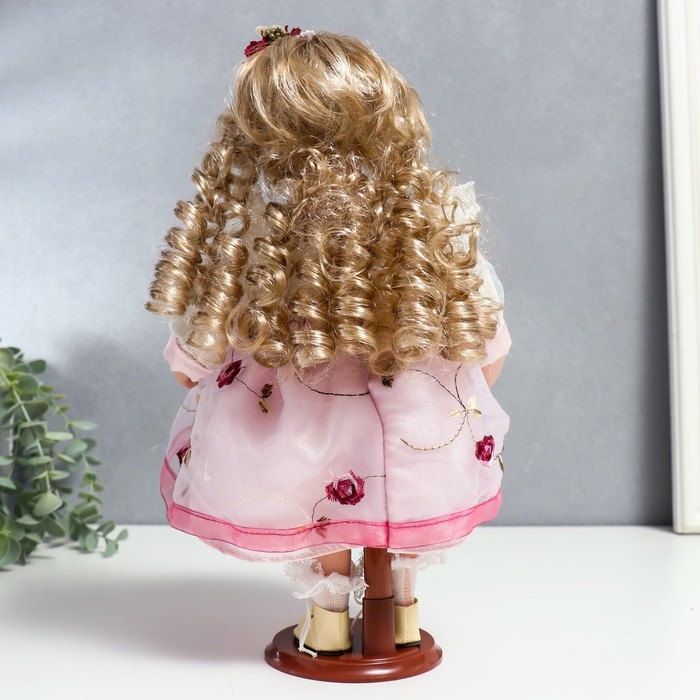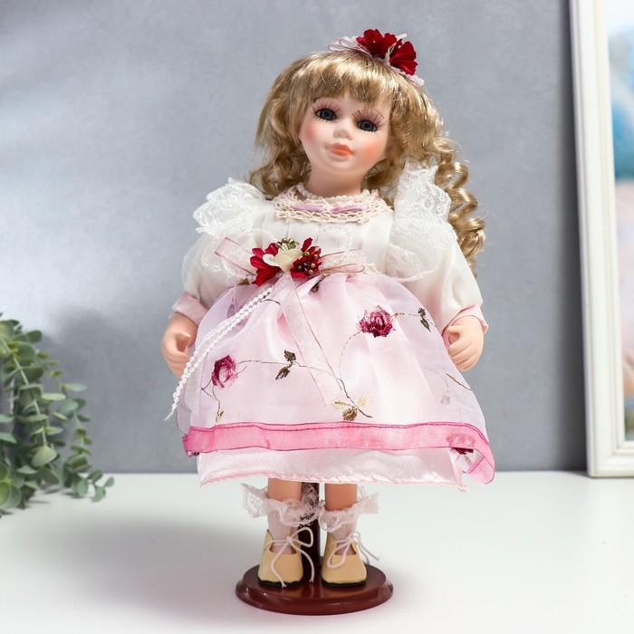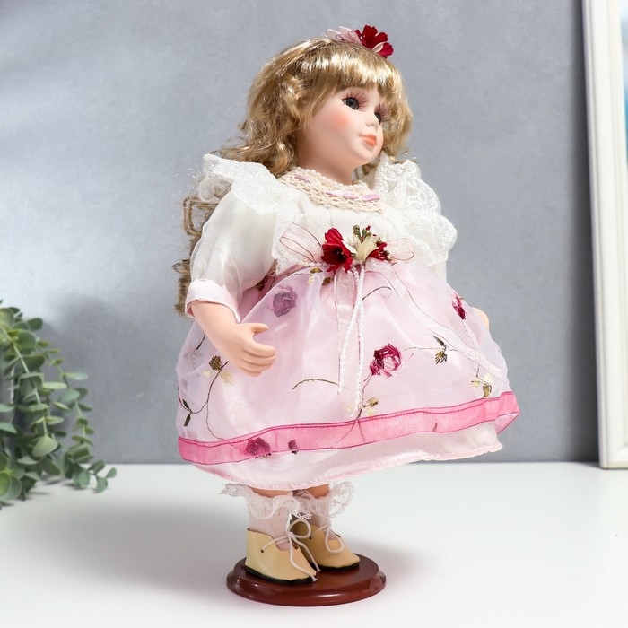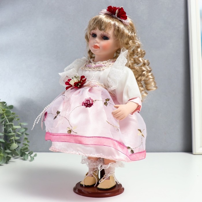 Кукла коллекционная керамика "Агата в бело-розовом платье и с цветами в волосах" 30 см
