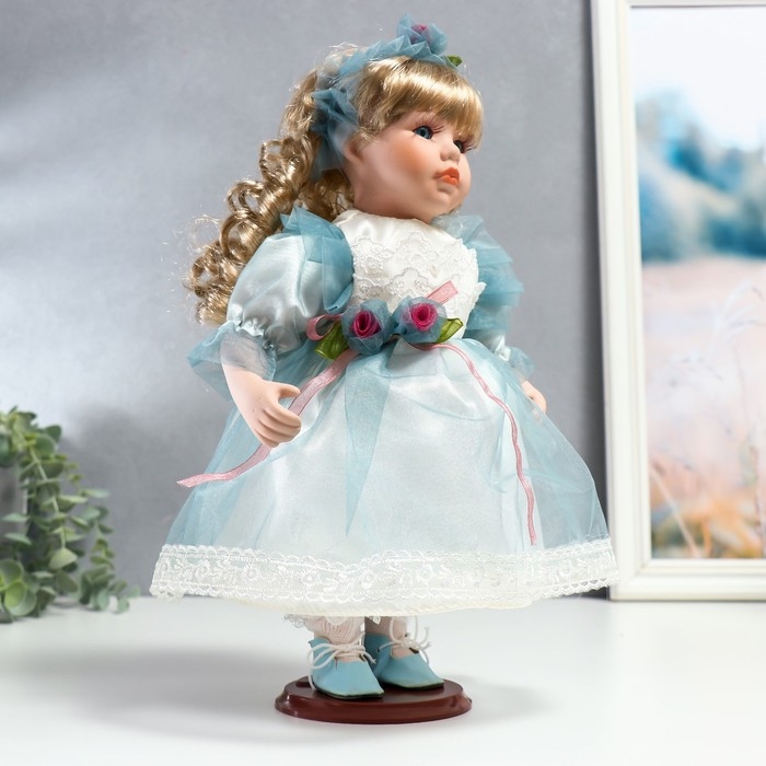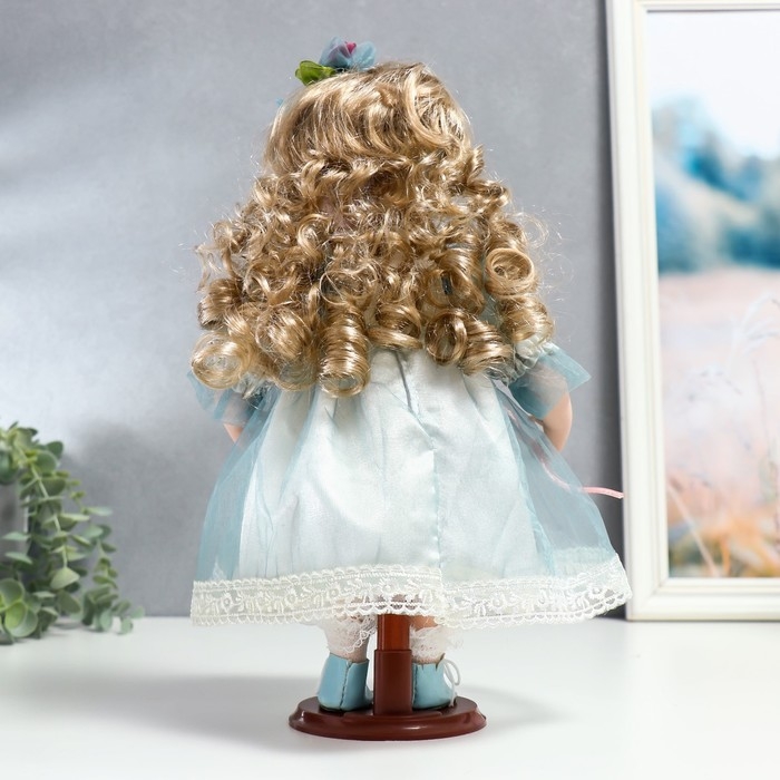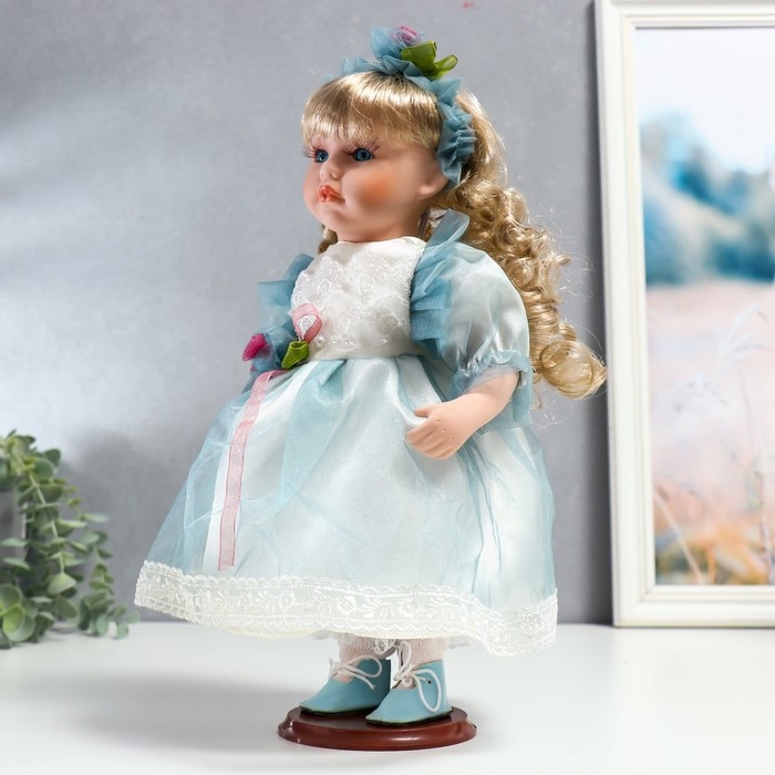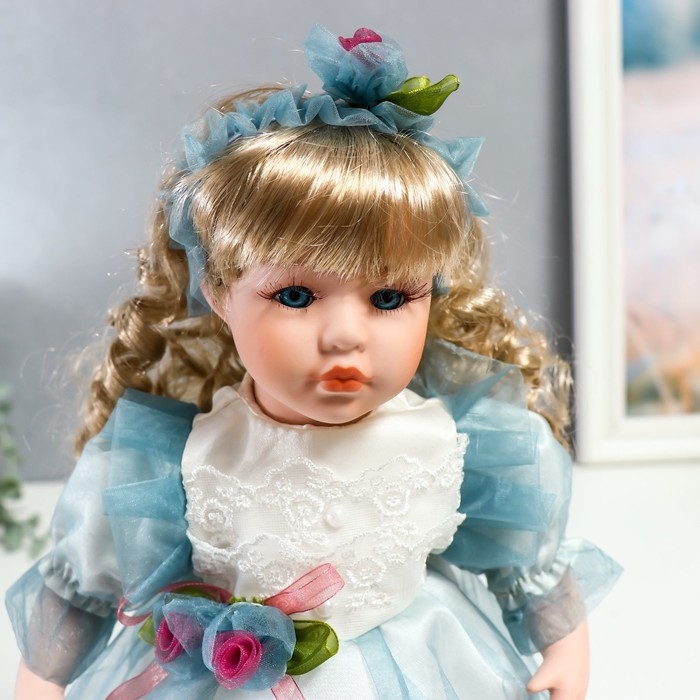 Кукла коллекционная керамика "Флора в бело-голубом платье и лентой на голове" 30 см