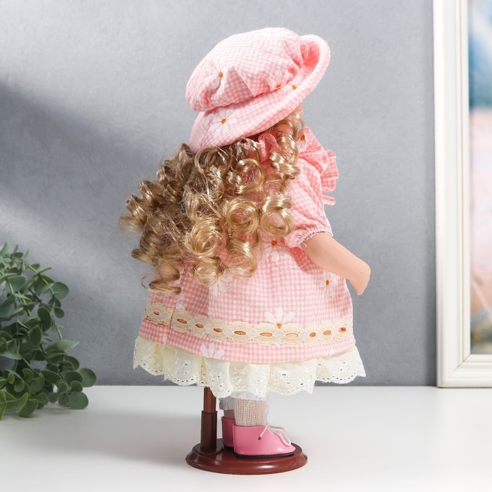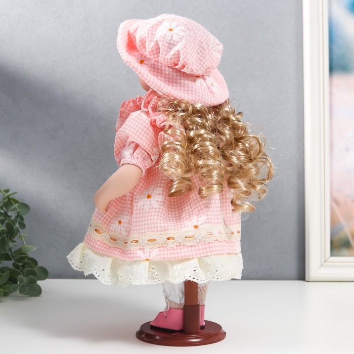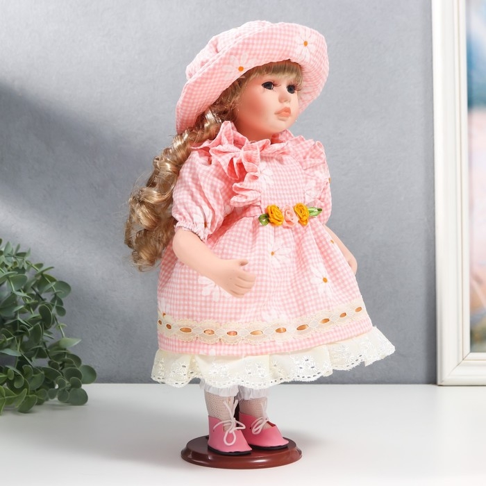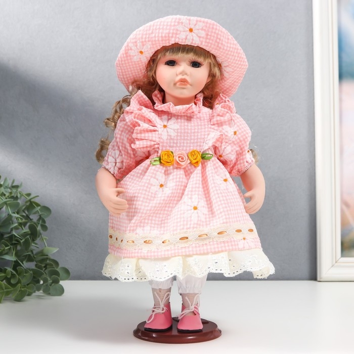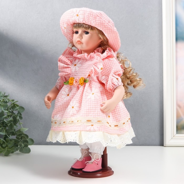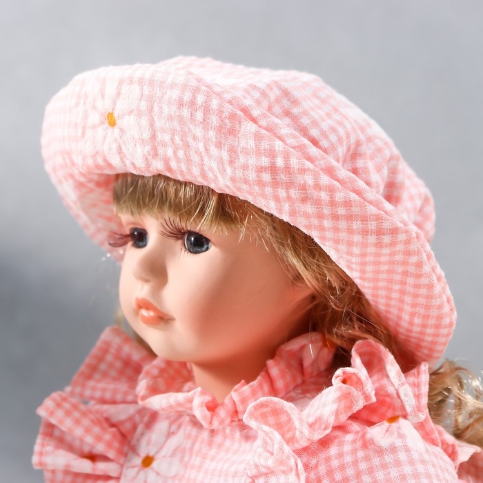 Кукла коллекционная керамика "Маша в розовом платье в клетку с ромашками, в шляпке" 30 см