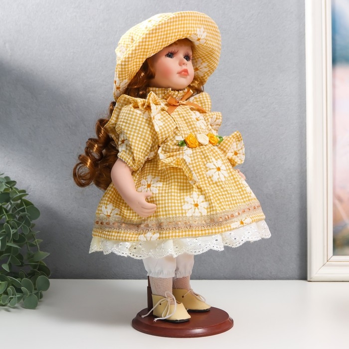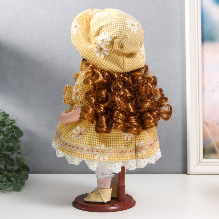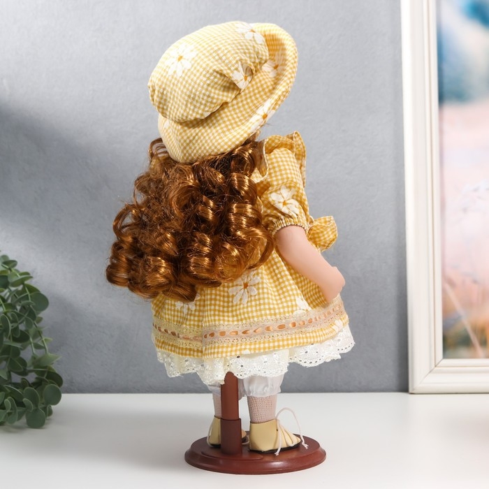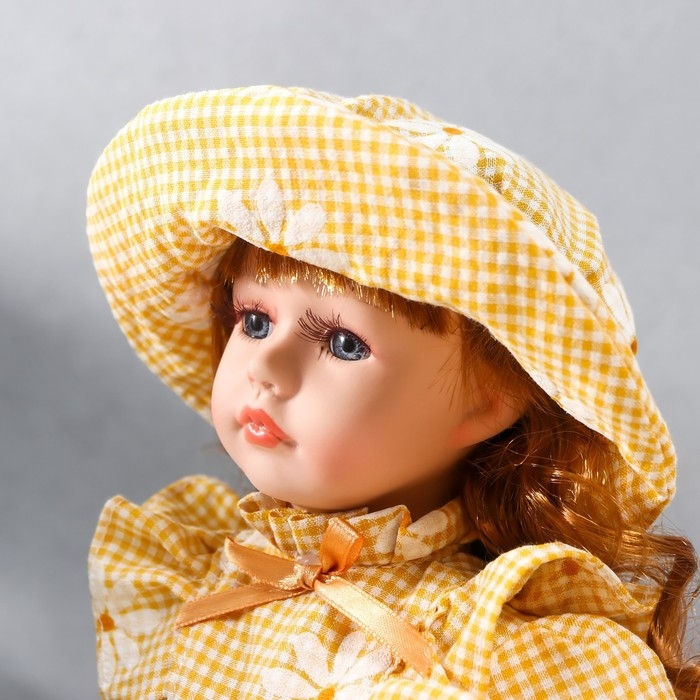 Кукла коллекционная керамика "Маша в жёлтом платье в клетку с ромашками, в шляпке" 30 см
