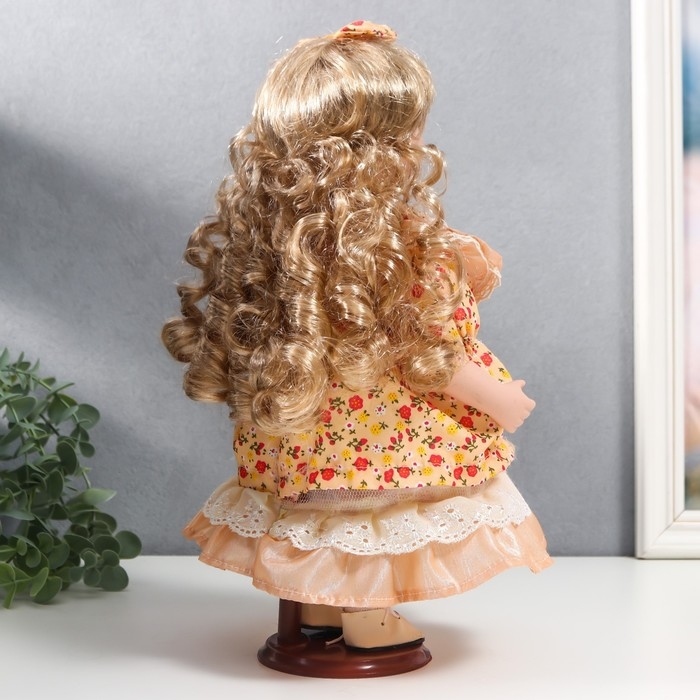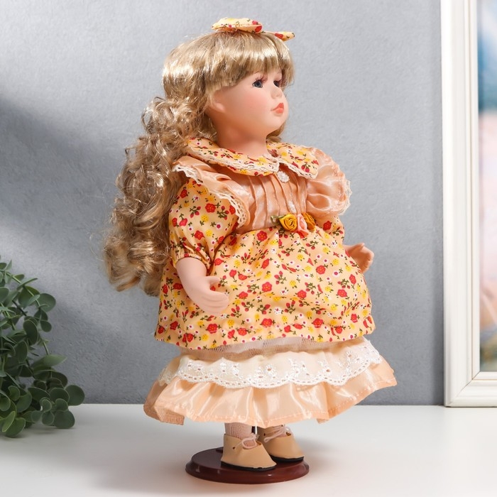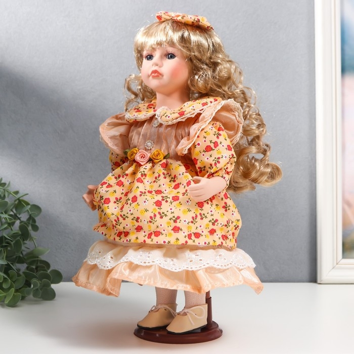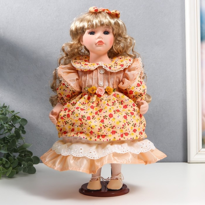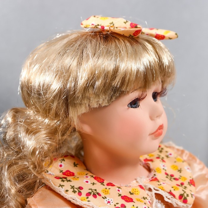 Кукла коллекционная керамика "Тося в кремовом платье с цветочками, с бантом в волосах" 30 см 75861
