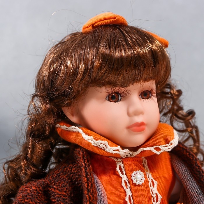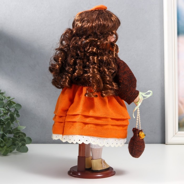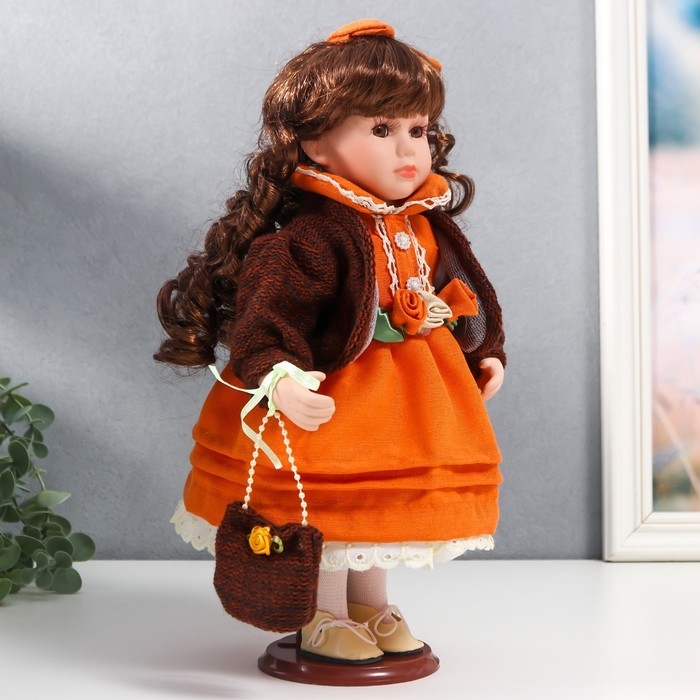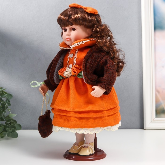 Кукла коллекционная керамика "Василиса в ярко-оранжевом платье, с рюшами, с сумочкой" 30 см