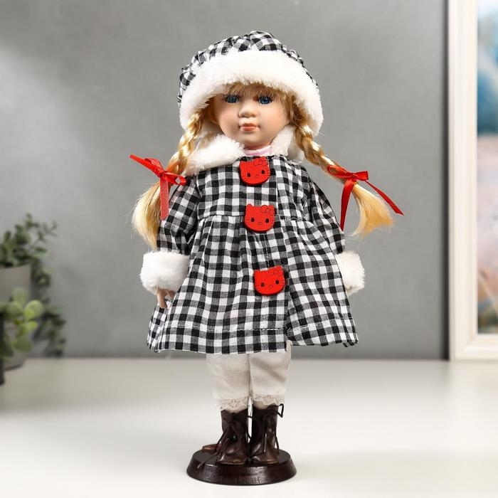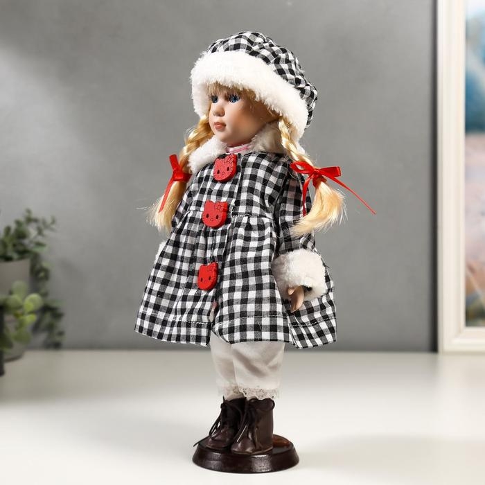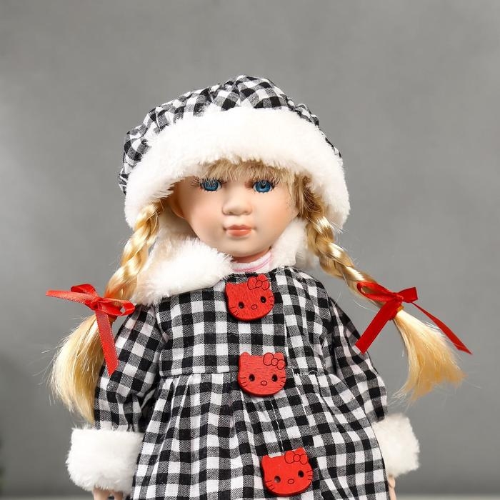 Кукла коллекционная керамика "Злата в пальто в клеточку с красными пуговицами" 30 см
