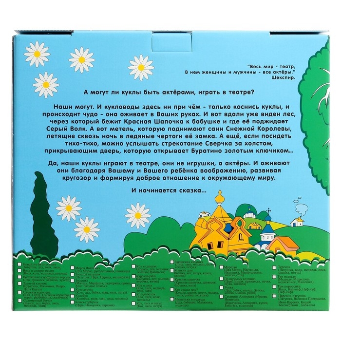 В набор входит детально прописанный сценарий и куклы-персонажи: