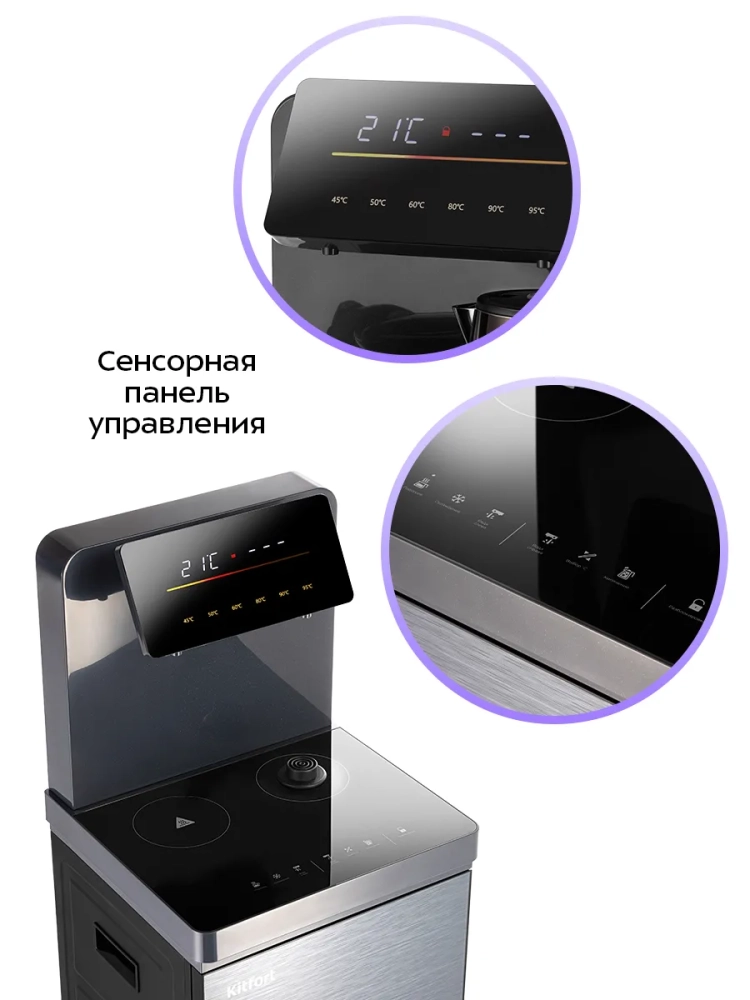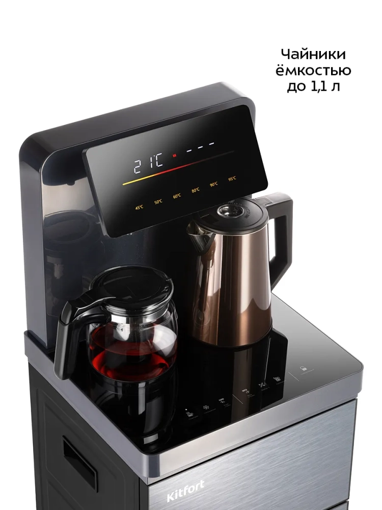 Кулер с чайным столиком Kitfort КТ-6694 совмещает в себе функции электрической помпы для воды и чайного набора, состоящего чайника и заварочного чайника с фильтром. Кулер обеспечивает закрытое хранение емкости для воды, а также имеет полку для хранения, закрываемую дверцей. Прибор имеет два носика для подачи воды: одни для подачи воды в чайник, второй для подачи воды в любую емкость. Вы можете налить воду в чайник, не снимая его с базы, что очень удобно. Наличие в комплекте не только чайника для нагрева воды, но и заварочного чайника с фильтром позволяет заварить чай или кофе. За счет встроенной платформы с подогревом можно сохранить готовый напиток теплым. В данной модели также есть режим подачи охлажденной воды.