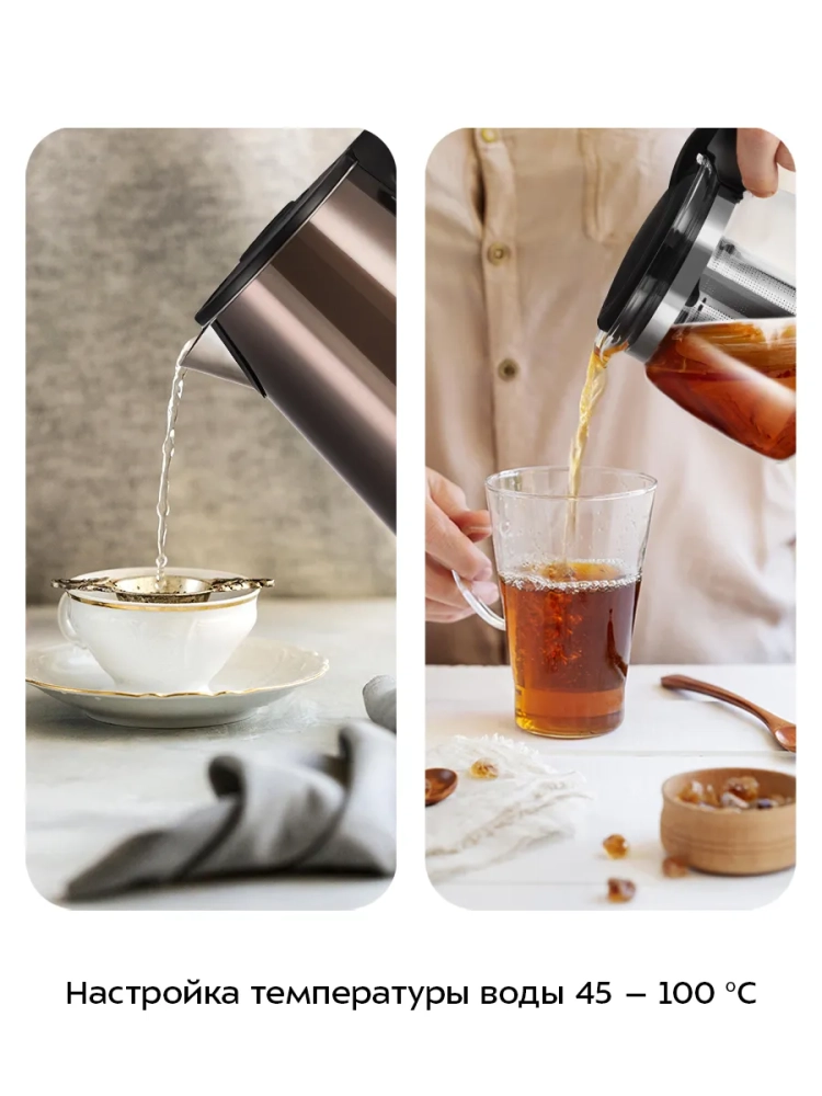 В чайнике можно не только вскипятить воду, но и нагреть до температуры 45, 50, 60, 80, 90 или 95 °С. После нагрева воды до заданной температуры чайник автоматически перейдет в режим поддержания температуры. Время поддержания температуры — 6 часов, изменить установленное время нельзя.