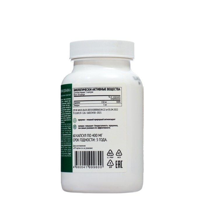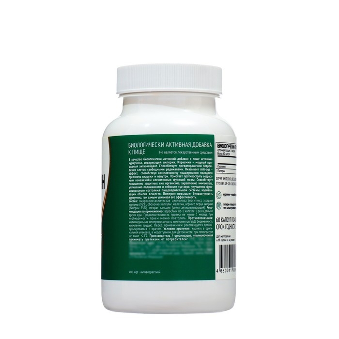 БАД Куркумин 150 мг содержащий Пиперин – мощный природный антиоксидант. Оказывает Anti-age – эффект, способствуя комплексному поддержанию молодости организма снаружи и изнутри. Помогает противостоять возрастным изменениям когнитивных функций мозга. Куркумин 150 mg с пиперином способствует повышению защитных сил организма, укреплению иммунитета, улучшению подвижности и гибкости суставов, улучшению функционального состояния пищеварительной системы, нормализации обмена веществ. Пиперин повышает биодоступность Куркумина, тем самым усиливая его эффективность. Прием куркумина способствует ускорению восстановления организма после занятий спортом. В совокупности с правильным питанием и тренировками куркумин является одним из ценных компонентов для предупреждения набора лишнего веса, так как благоприятно влияет на метаболизм и уровень сахара в крови. Экстракт куркумы содержит 95% куркумина. Рекомендуем принимать по 1 капсуле 1 раз в день во время еды.