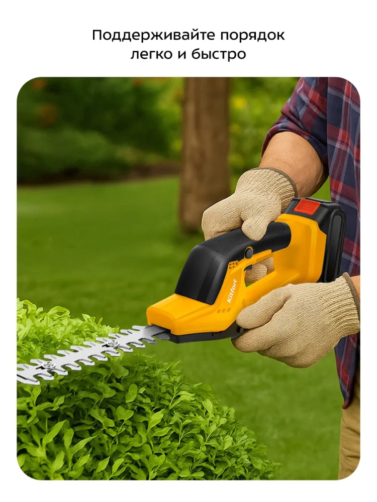 Аккумуляторный кусторез Kitfort KT-4303 предназначен для стрижки травы и кустарников с ветками малой толщины. Устройство станет незаменимым помощником в саду или на даче и поможет поддерживать территорию участка в ухоженном состоянии.