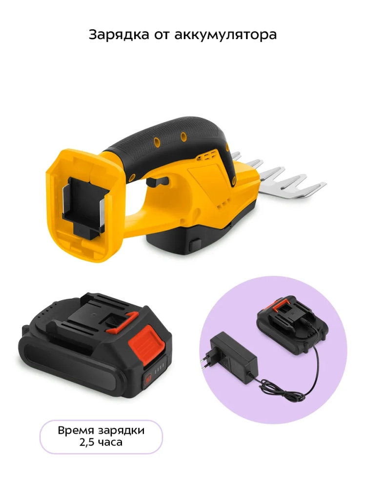 Благодаря работе от аккумулятора кусторез не нужно включать в розетку и провода не будут мешать во время работы. При полном заряде аккумулятора кусторез может работать до 75 минут.