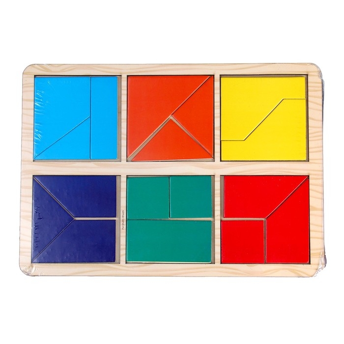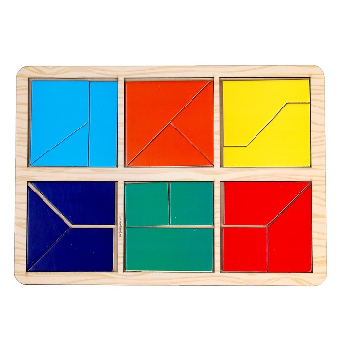 Задача малыша - собрать квадраты из цветных элементов: треугольников, прямоугольников и других фигур в рамку. Сначала можно собирать изображения с животными,а затем однотонные картинки.